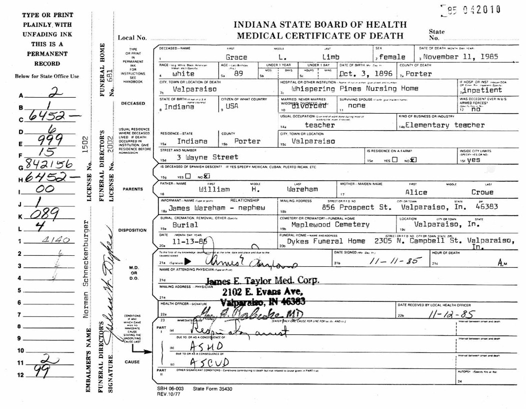 - Indiana, U.S., Death Certificates, 1899-2017 > Name: Mrs Alice G Wareham; Gender: Female; Race: White; Marital Status: Widow; Age: 80; Birth Date: 29 Sep 1867; Birth Place: Valparaiso, Indiana; Death Date: 28 Feb 1948; Death Place: Valparaiso, Porter, Indiana, USA; Death Registration Date: 1948; Father: Whartorn M Crowe; Mother: Elnora Keena; Spouse: Wm H Wareham