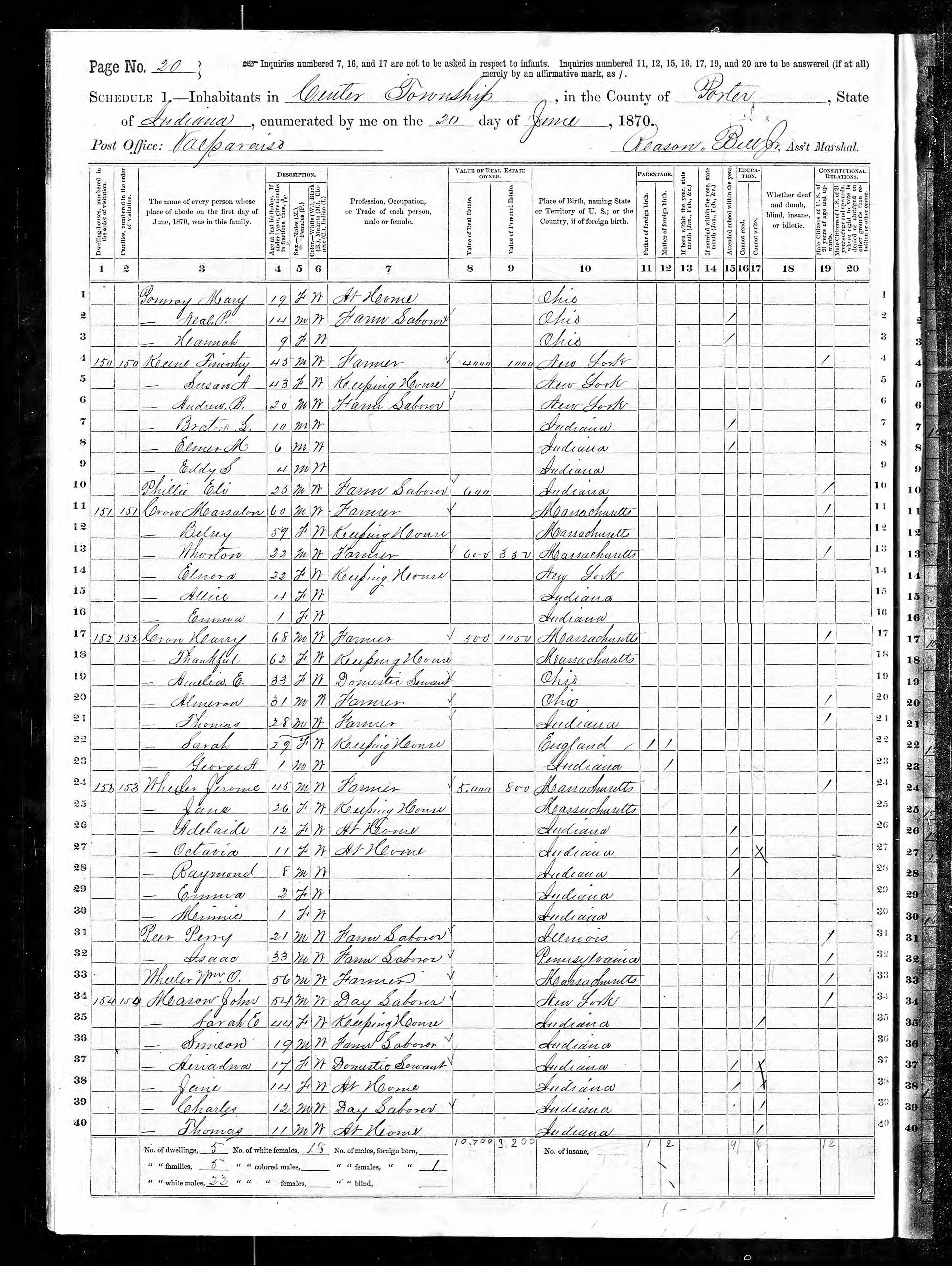 - 1870 United States Federal Census > Indiana > Porter > Center > Allice Crow, age 4 years living with grandparents Marsalon Crow (farmer, 60) and Belsey Crow (59), parents Whorton Crow (farmer, 22) and Elnora Crow (22) and sister Emma Crow (1)