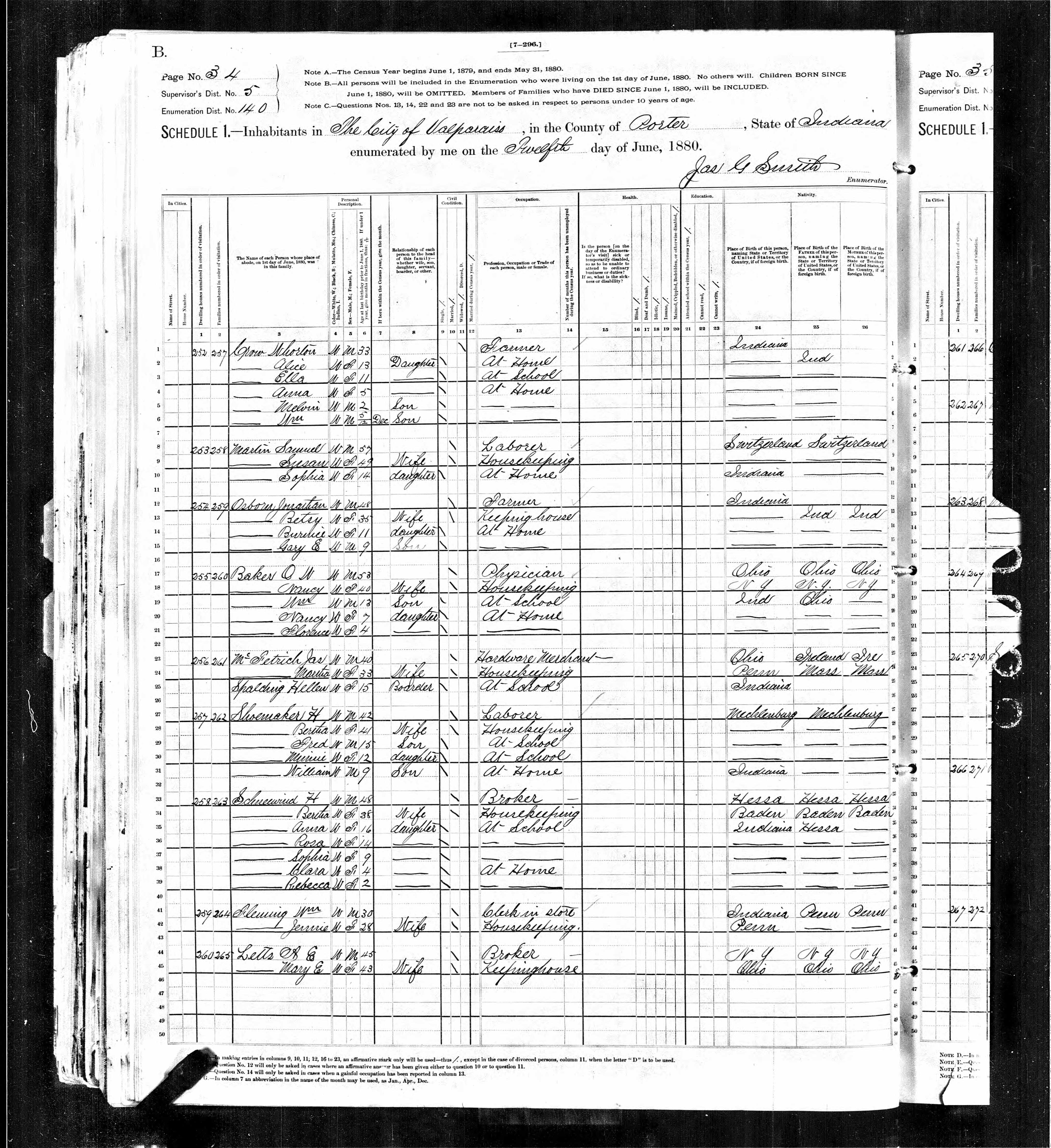 - 1880 United States Federal Census > Indiana > Porter > Valparaiso > 140 > Allice Crow, age 13 years living with father Whorton Crow (farmer, 33, widowed) and siblings Ella Crow (11), Anna Crow (5), Melvin Crow (2) and Wm. Crow (5/12)