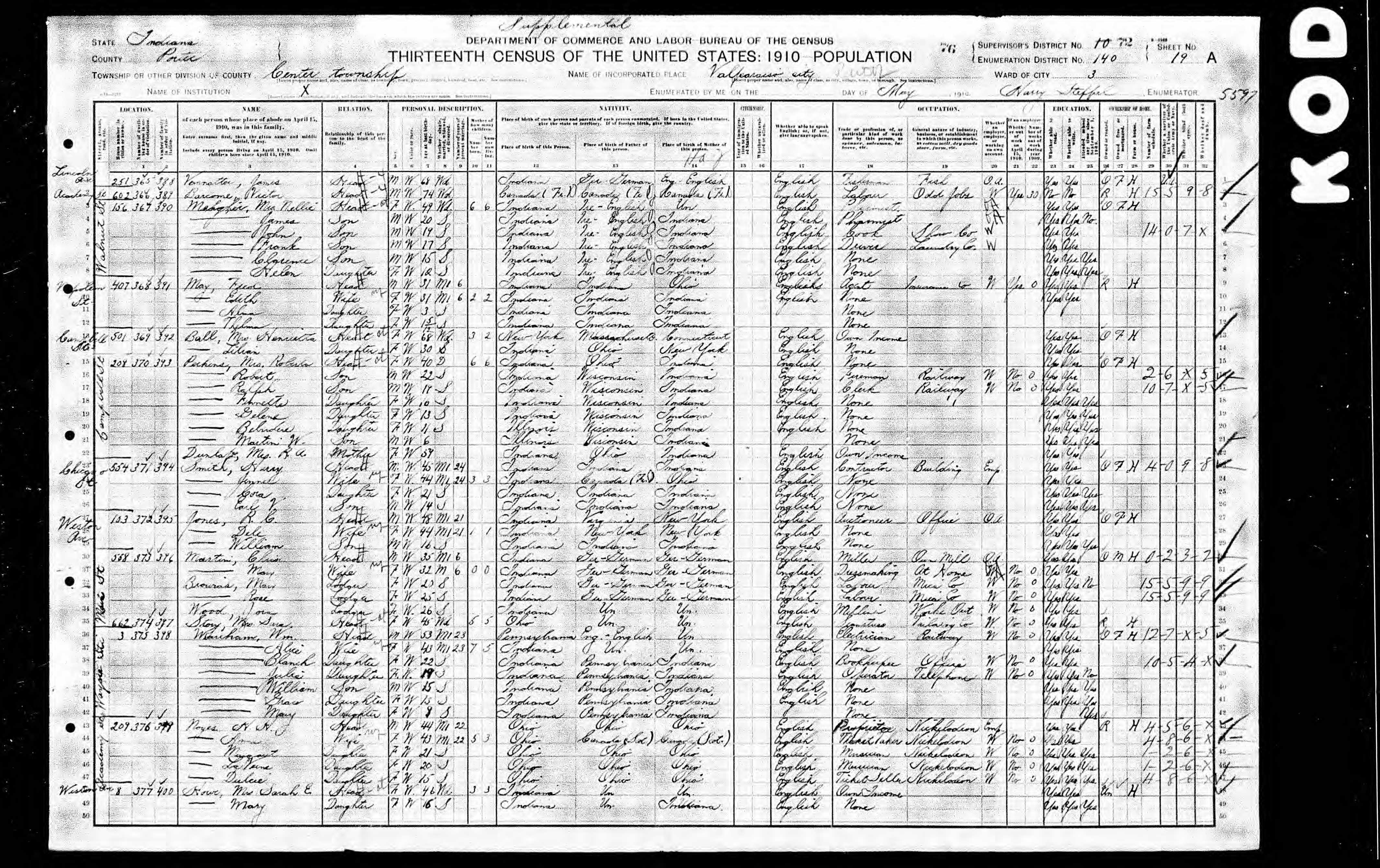 - 1910 United States Federal Census > Indiana > Porter > Valparaiso Ward 3 > District 0143 > Alice Wareham, age 43 years living with husband William Wareham (railway electrician, 53), and children Blanch Wareham (bookkeeper, 22), Julia Wareham (telephone operator, 19), William Wareham (15), Grace Wareham (13) and Mary Wareham (8)