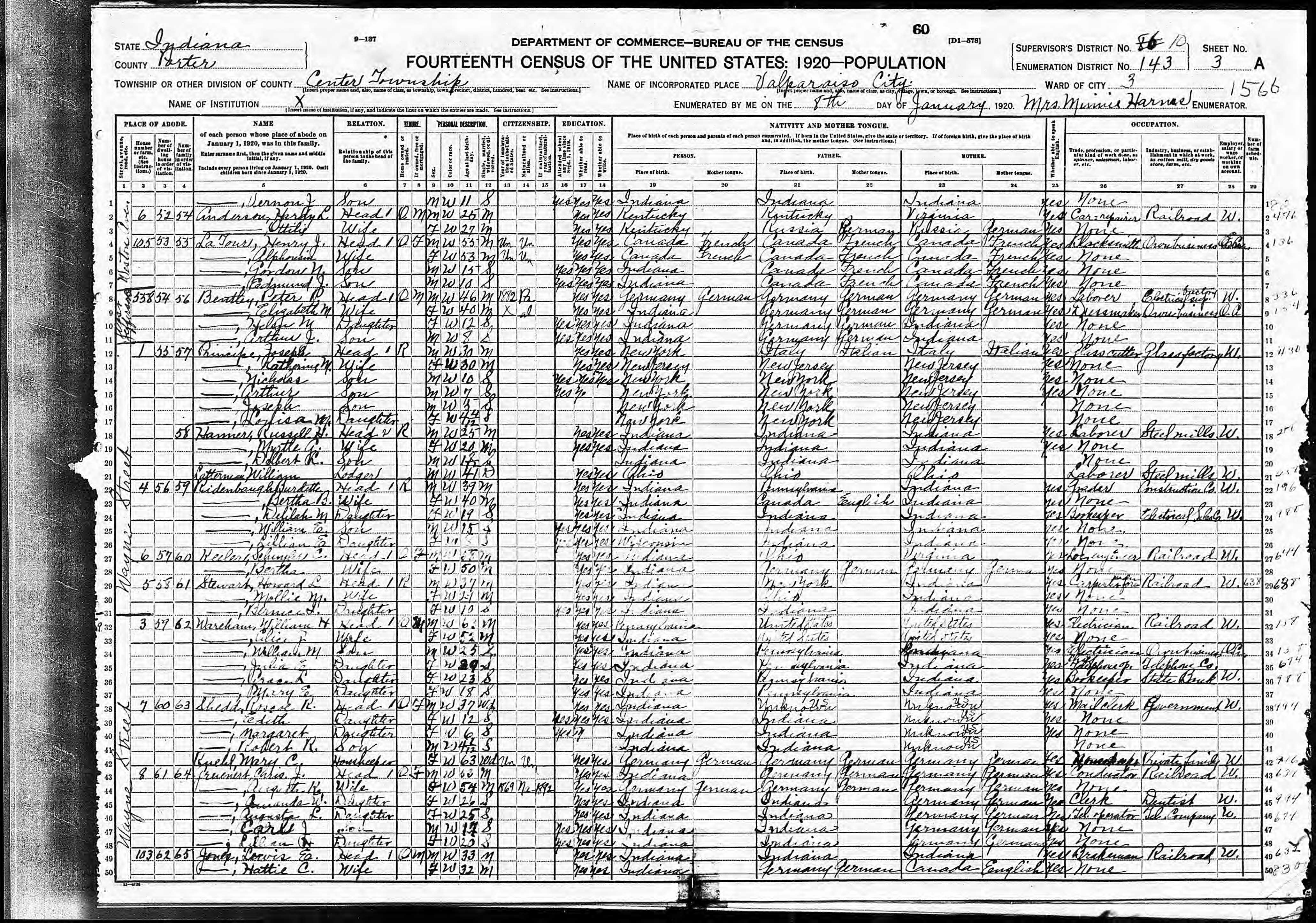 - 1920 United States Federal Census > Indiana > Porter > Valparaiso Ward 3 > District 0143 > Alice Wareham, married, age 52 years living with husband William Wareham (railway electrician, 63), and children William Wareham (electrician, 25), Julia Wareham (chief telephone operator, 29), Grace Wareham (bookkeeper, 23) and Mary Wareham (18)