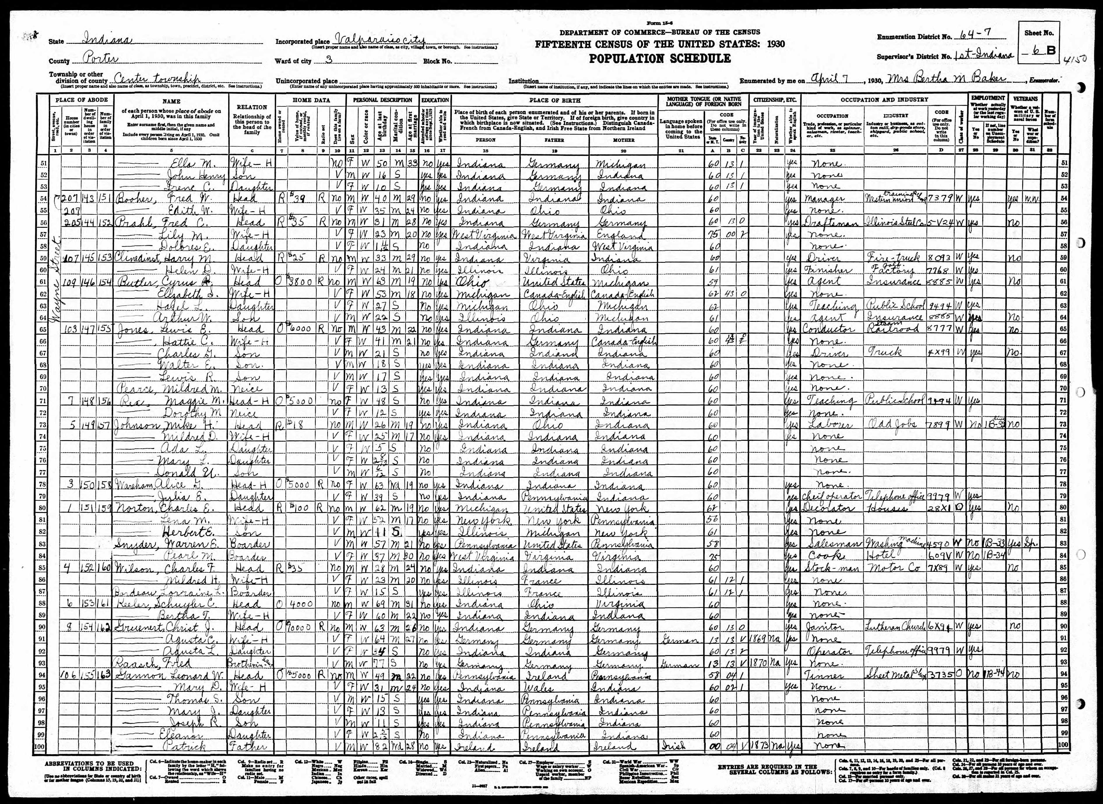 - 1930 United States Federal Census > Indiana > Porter > Valparaiso > District 0007 > Alice G Wareham, widowed, age 63 years, living with daughter Julia E Wareham (chief telephone operator, 39)