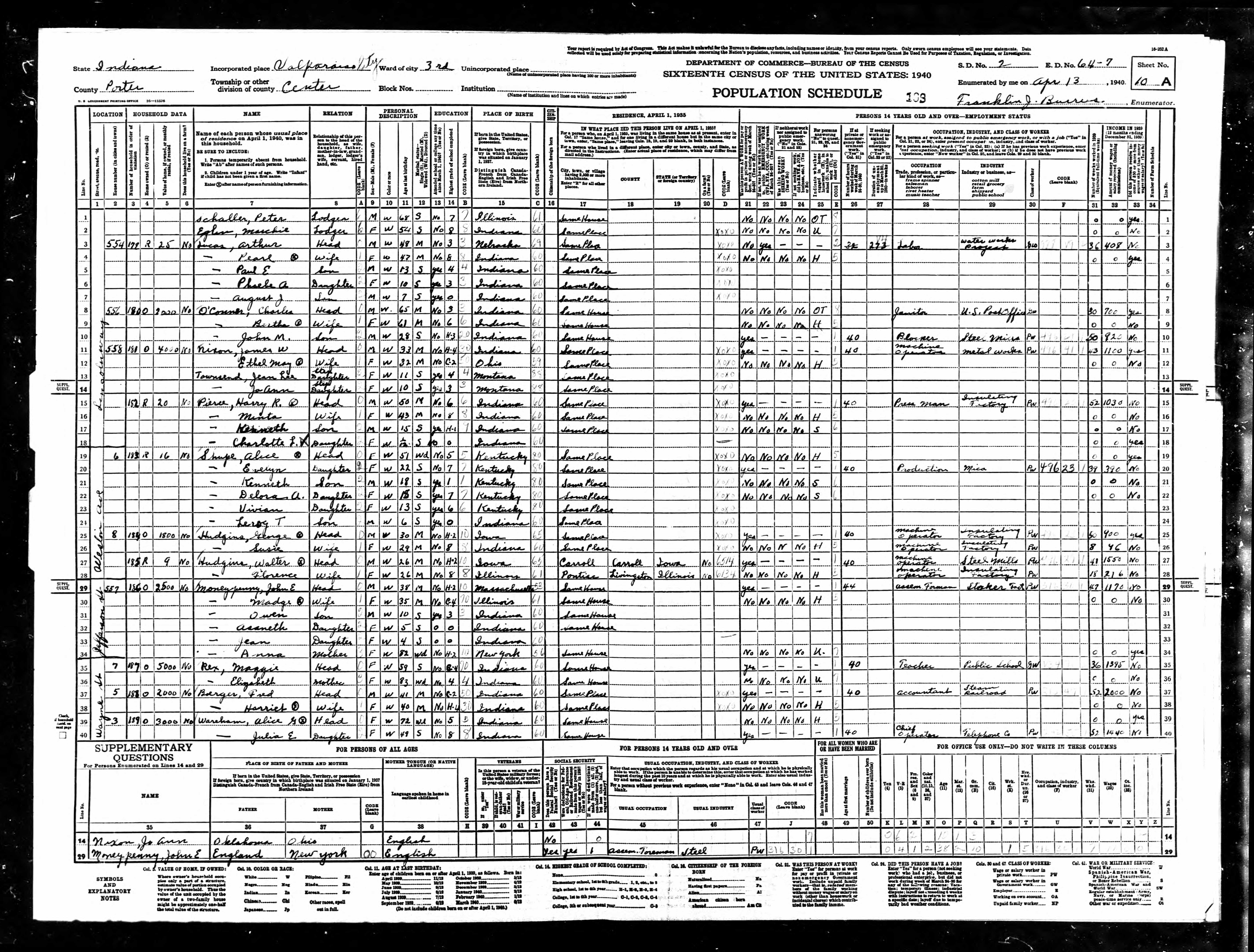 - 1940 United States Federal Census > Indiana > Porter > Valparaiso > 64-7 > Alice G Wareham, widowed, age 72 years, living with daughter Julia E Wareham (chief telephone operator, 48)