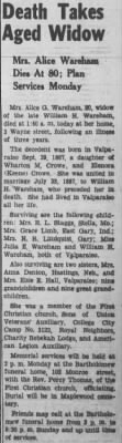Death Takes Aged Widow – Mrs. Alice Wareham Dies At 80; Plan Services Monday