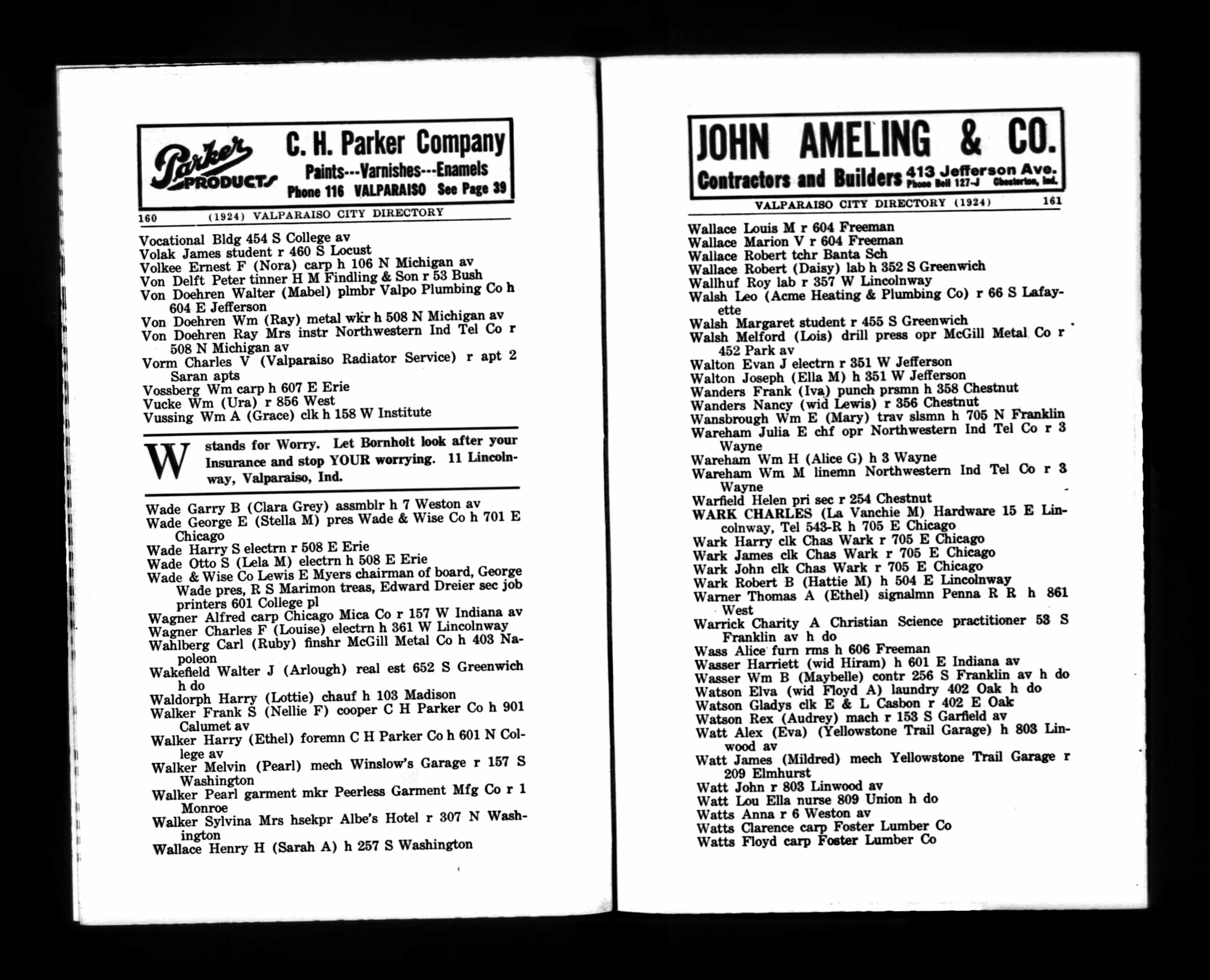 - U.S., City Directories, 1822-1995 > Valparaiso, Indiana, City Directory, 1924 > Wareham, Wm (Alice G) h 3 Wayne