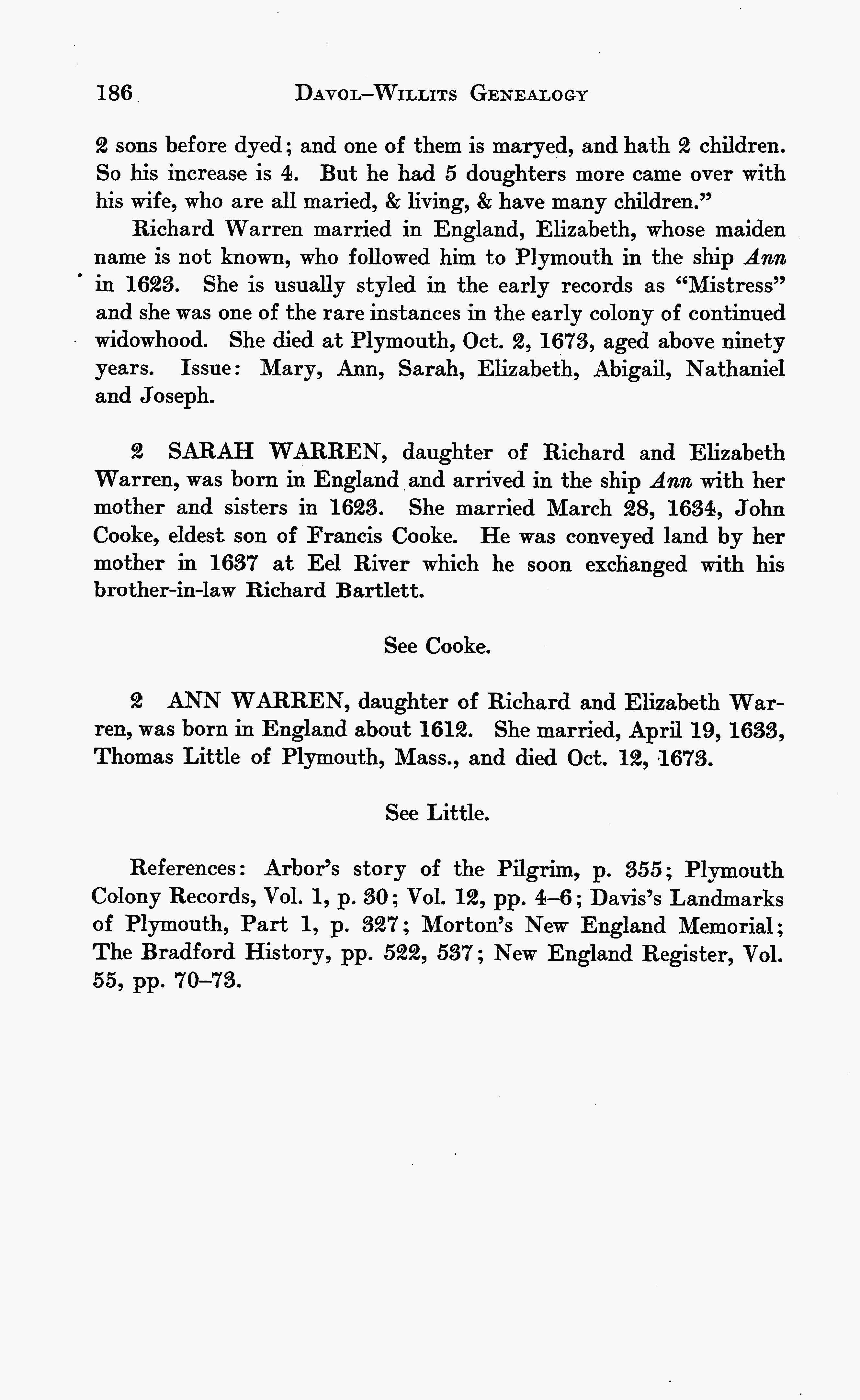 - Davol-Willits genealogy > Daughter of Richard and Elizabeth Warren, was born in England about 1612.