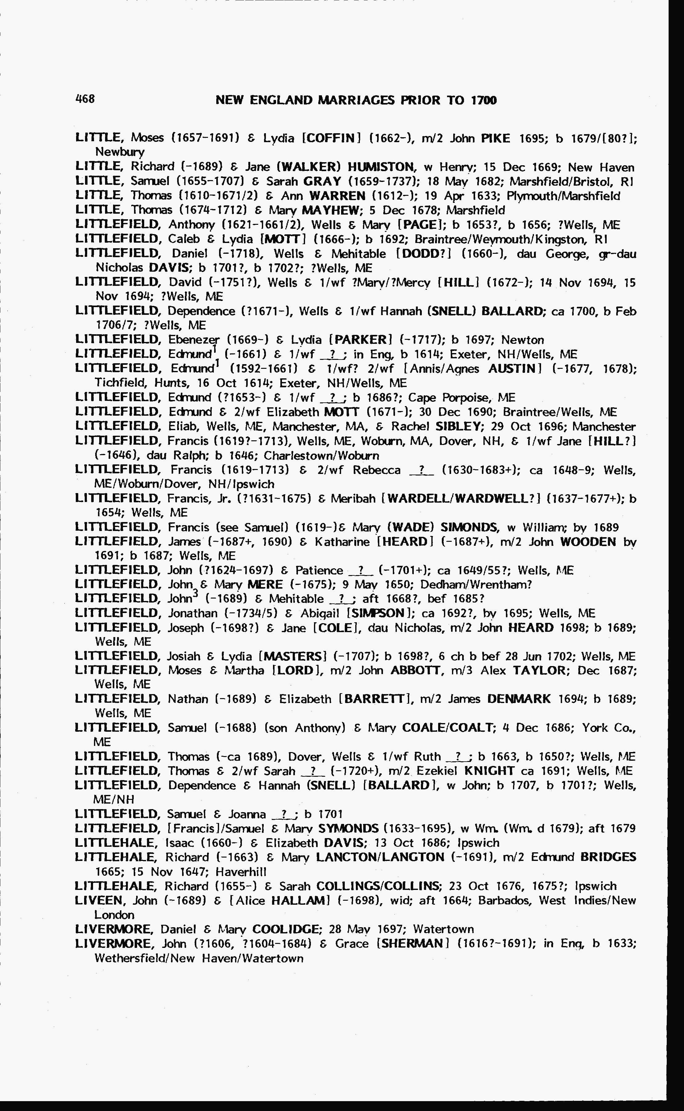 - New England Marriages Prior to 1700 > LITTLE, Thomas (1610-1671/2) & Ann Warren (1612-); 19 Apr 1633; Plymouth/Marshfield