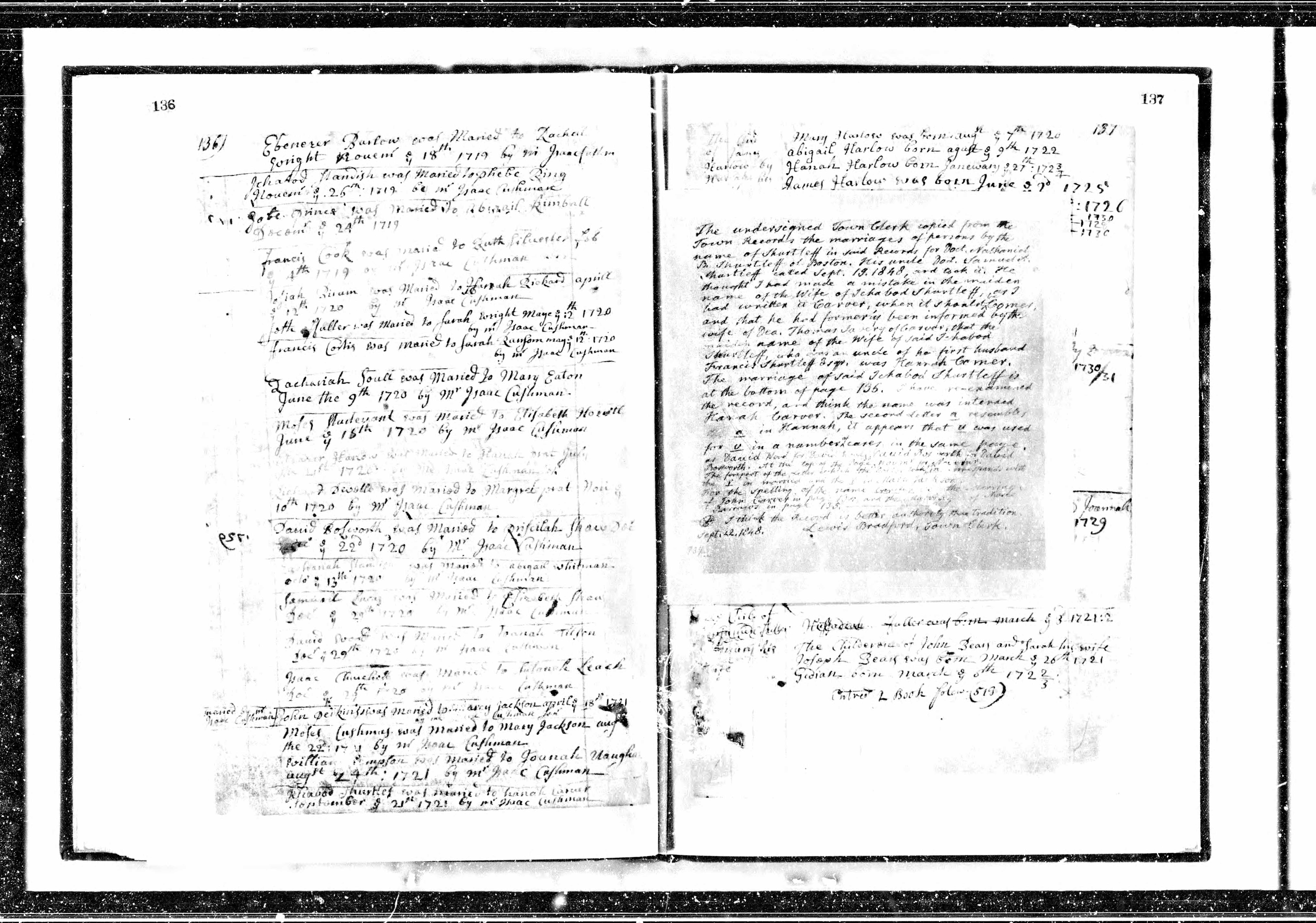 - Massachusetts, U.S., Town and Vital Records, 1620-1988 > Plympton > Town Records, with Births, Marriages, and Deaths > Name: David Bosworth; Record Type: Marriage; Marriage Date: 22 Dec 1720; Marriage Place: Plympton, Massachusetts, USA; Spouse: Priscilah Shaw