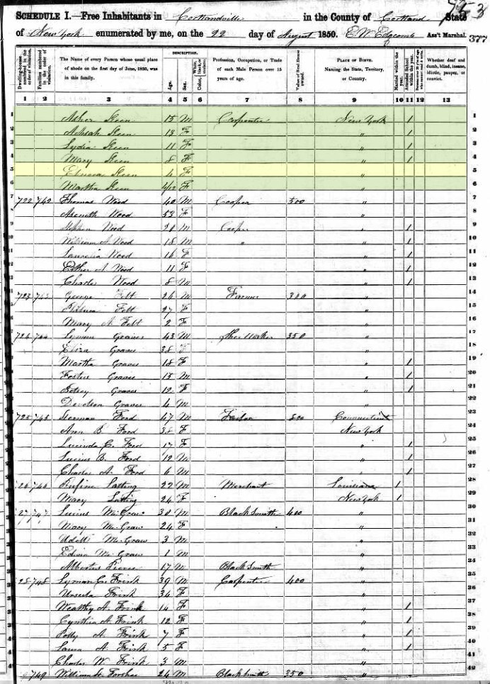 - 1850 United States Federal Census Page 1 Page 2 > New York > Cortland > Cortlandville > Elnora Keen, age 4 living with parents Zebulon Keen (carpenter, 39) and Hannah Keen (34) and siblings Asher Keen (15), Achsah Keen (13), Lydia Keen (11), Mary Keen (8), and Martha Keen (4/12)