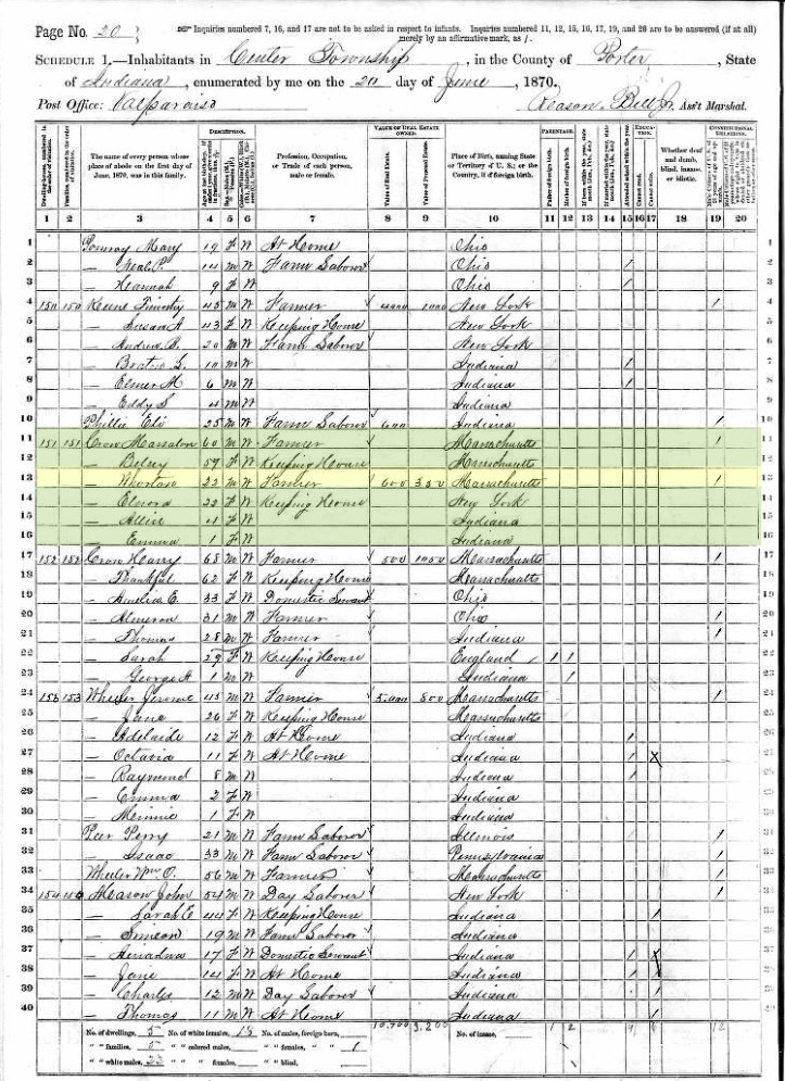 - 1870 United States Federal Census > Indiana > Porter > Center > Elnora Crow (keeping house, 22) living with parents Maraiton Crow (farmer, 60) and Betsey Crow (keeping house, 59), husband Wharton Crow (farmer, 22) and children Alice Crow (4) and Emma Crow (0)