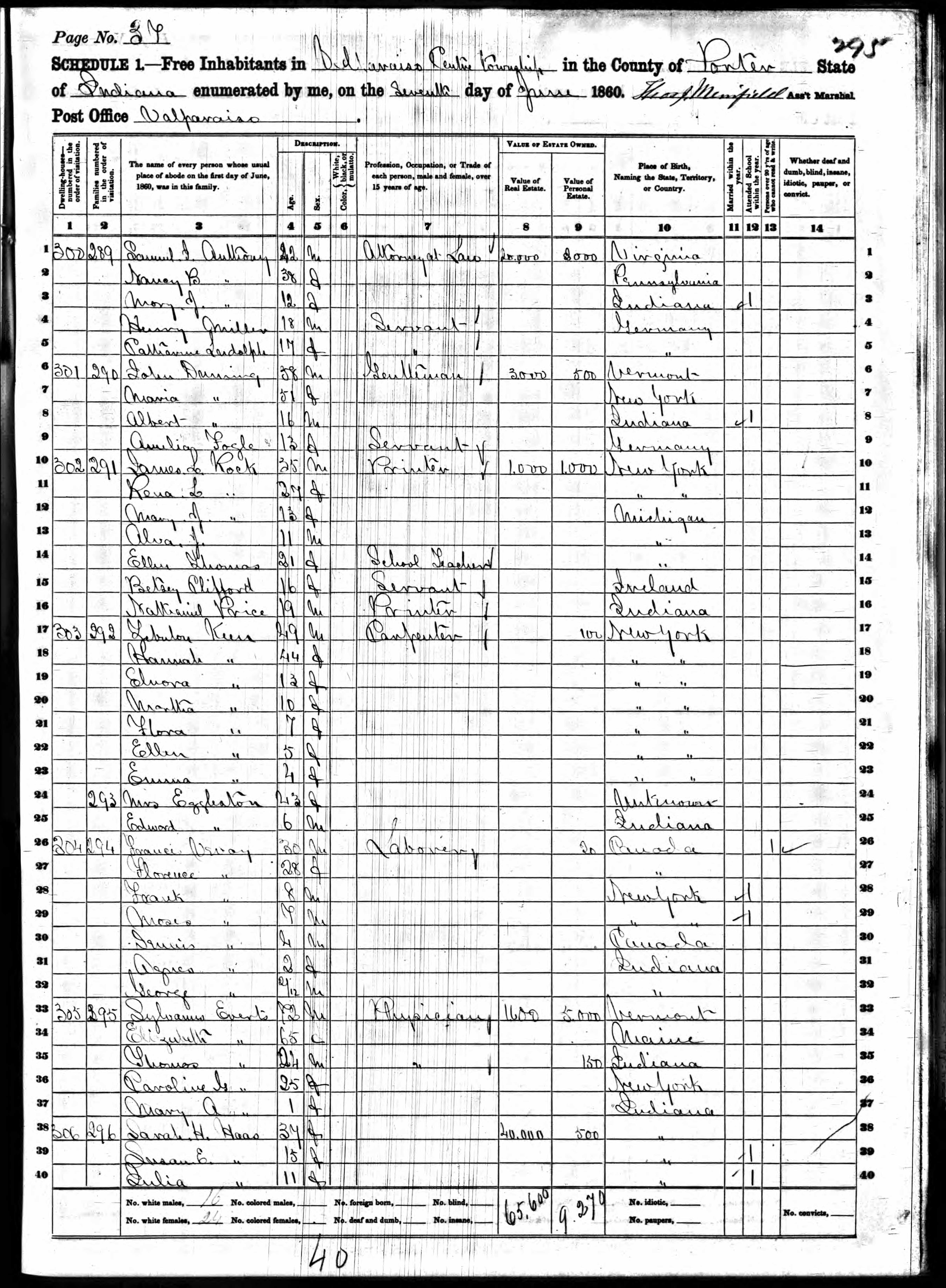 DEATH: 15 Jan 1880, Valparaiso Indiana, USA