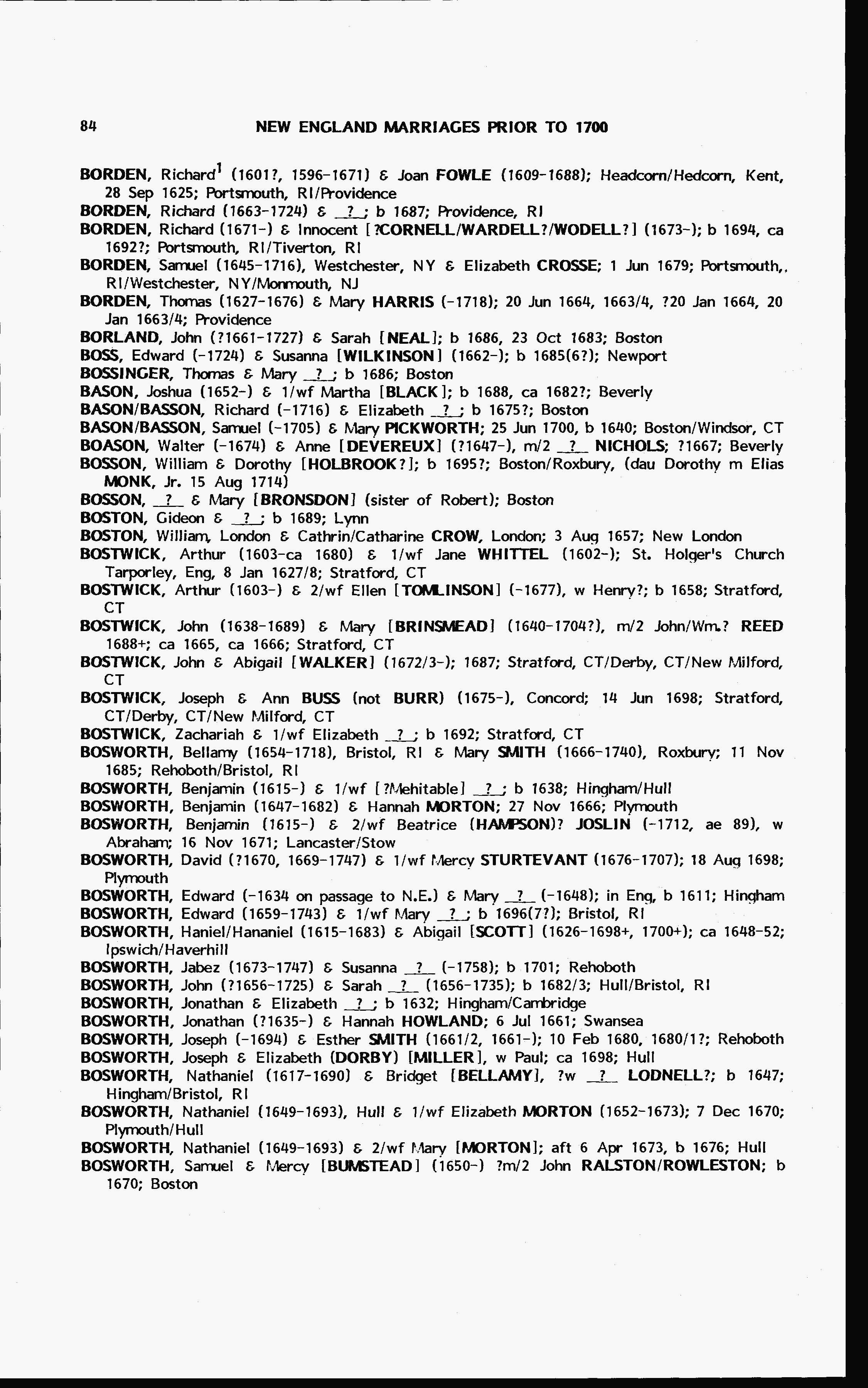 - U.S., New England Marriages Prior to 1700 > Name: Hannah Bosworth; Maiden Name: Howland; Gender: Female; Marriage Date: 6 Jul 1661; Marriage Place: New England, USA; Spouse: Jonathan Bosworth