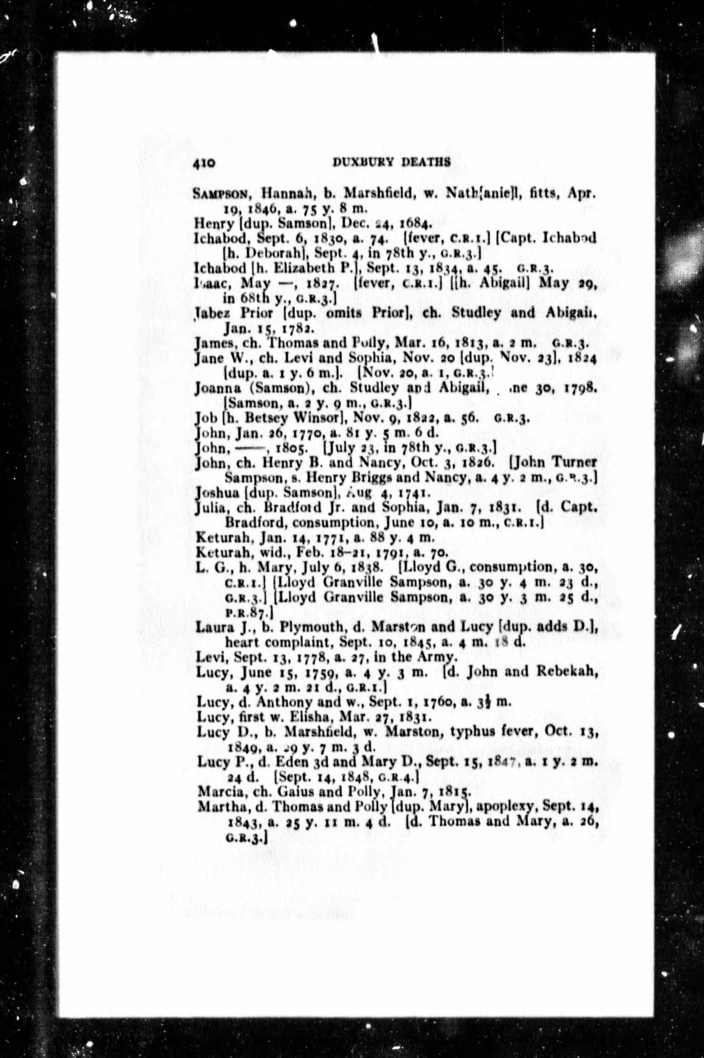 - Massachusetts, U.S., Town and Vital Records, 1620-1988 > Duxbury > Vital Record Transcripts > Name: Henry Sampson; Record Type: Death; Death Date: 24 Dec 1684; Death Place: Duxbury, Massachusetts, USA