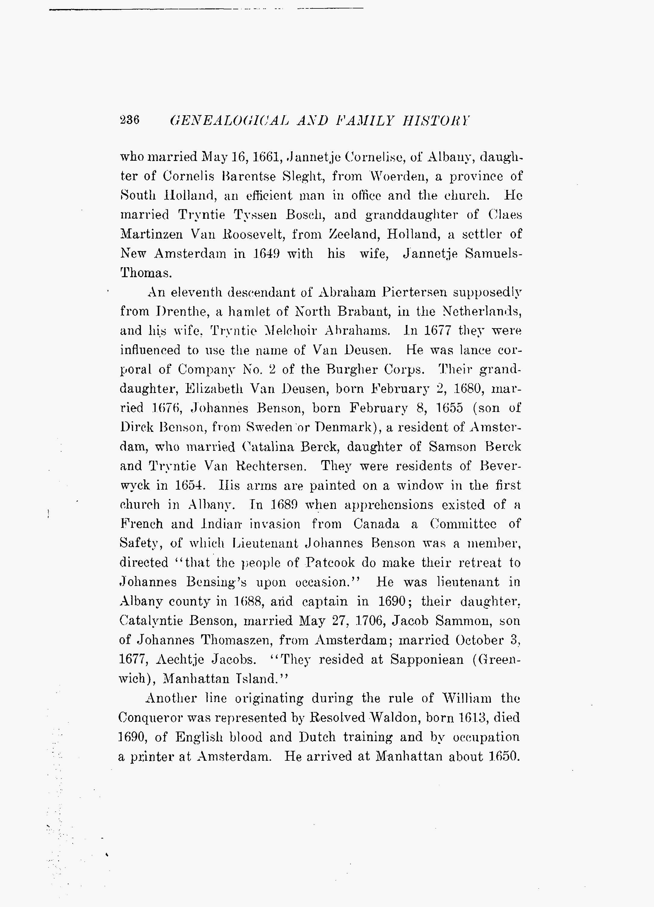 - Hudson-Mohawk Genealogical and Family Memoirs, Vol. III, Hudson-Mohawk Family Histories > Jacob, son of Johannes Thomasen and Aachtje (Jacobs) was baptized June 11, 1683. He married Catalyntje Bensen. She is believed to be the daughter of Johannes and Lysbet (Mattheuse) Bensen of Albany. > Children of Jacob and Catalyntje.