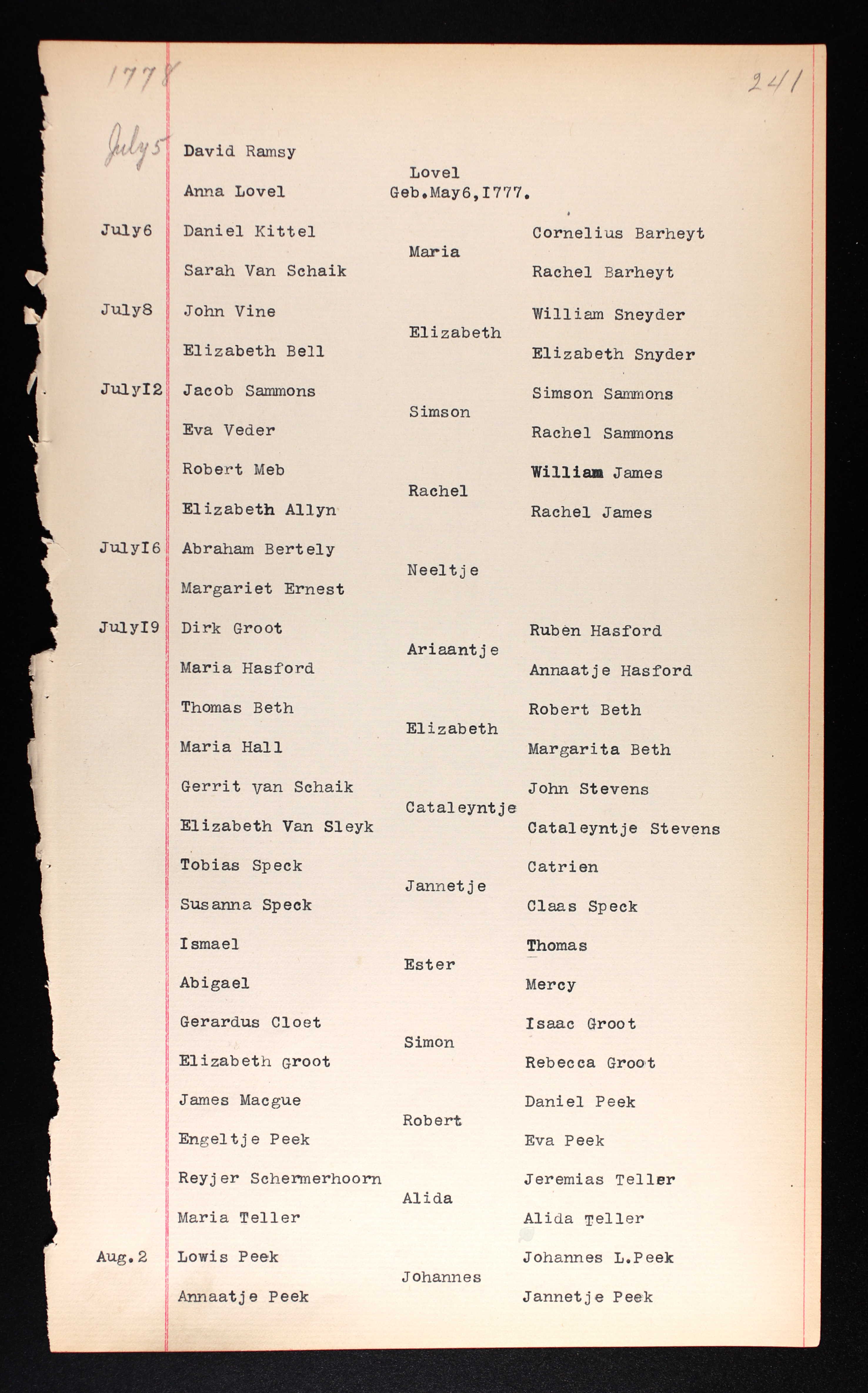 - U.S., Dutch Reformed Church Records in Selected States, 1639-1989 > Baptism entry 13 July 1777; Child: Simson Sammons; Parents: Jacob Sammons and Eva Veeder; witnesses: Simson Sammons and Rachel Sammons