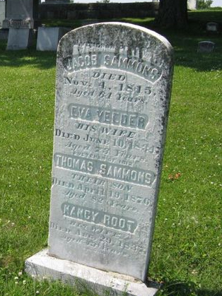 When Jacob Sammons was born on April 8, 1752, in Marbletown, New York, his father, Sampson, was 29 and his mother, Rachel, was 25. He married Eva Veeder on July 2, 1777, in Fonda, New York. He served in the American Revolution as a Lieutenant. They had 12 children in 23 years. He died on November 4, 1815, in Onondaga, New York, at the age of 63, and was buried in Westvale, New York.