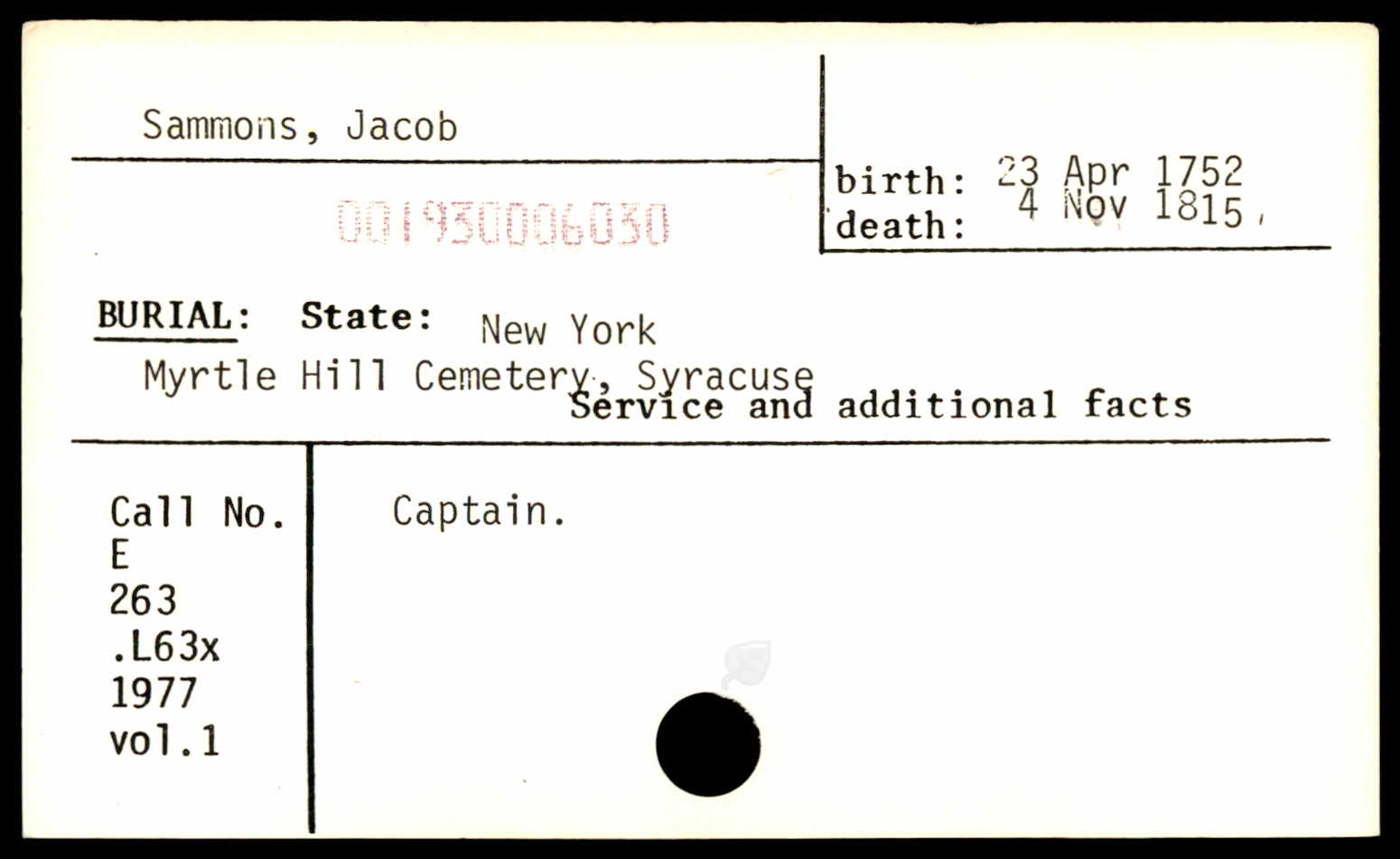 Jacob Sammons; Military Rank: Captain; Death Age: 63; Birth Date: 23 Apr 1752; Military Place: USA; Enlistment Place: USA; Death Date: 4 Nov 1815; Burial Cemetery: Myrtle Hill Cemetery; Burial Place: Syracuse, New York; Box Number: 3 - Abstract of Graves of Revolutionary Patriots > Jacob Sammons > Myrtle Hill Cemetery, Syracuse, New York