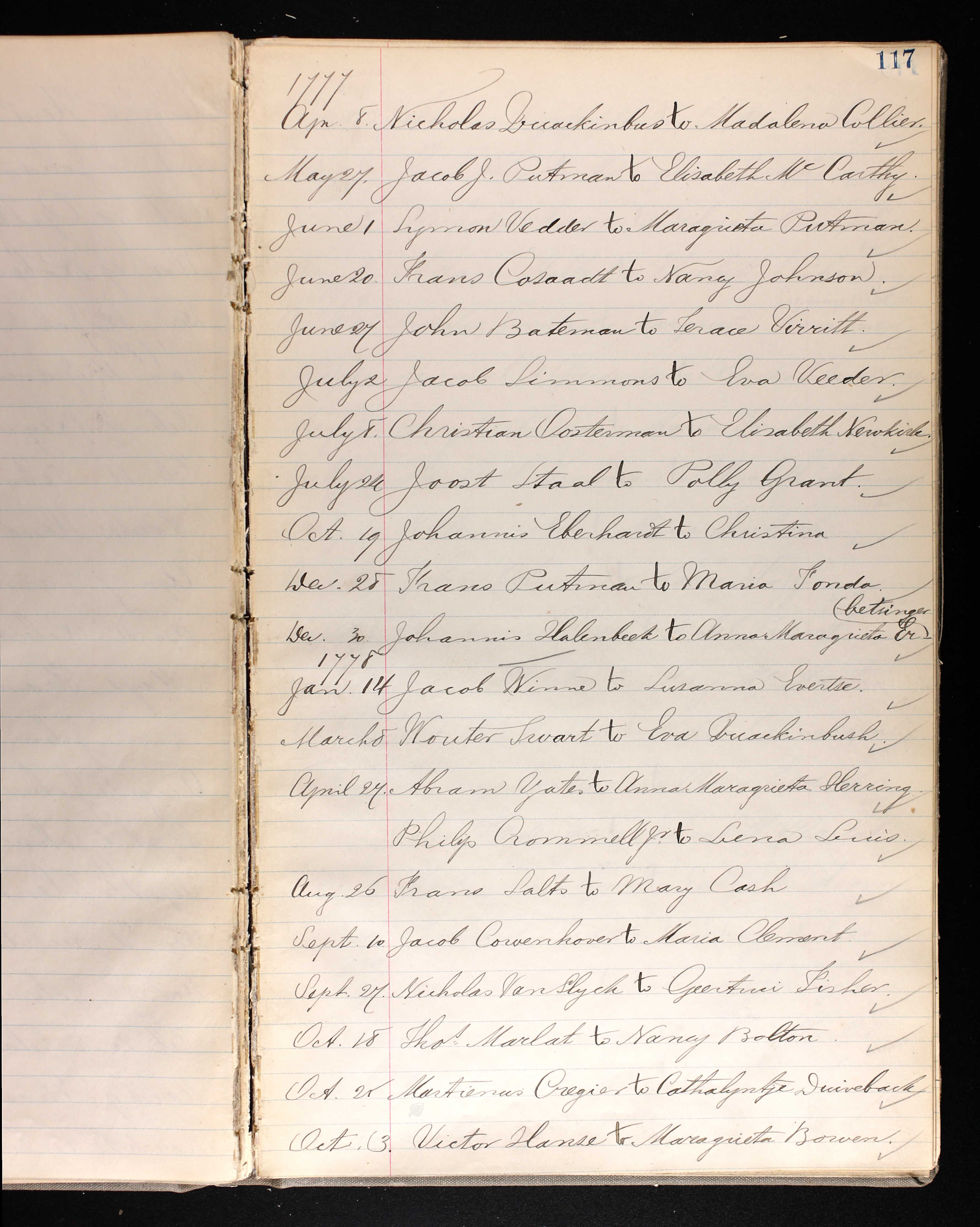 - U.S., Dutch Reformed Church Records in Selected States, 1639-1989 > Name: Jacob Sammons; Gender: Male; Record Type: Marriage; Marriage Date: 2 Jul 1777; Marriage Place: Fonda, Montgomery, New York, USA; Spouse: Eva Veeder