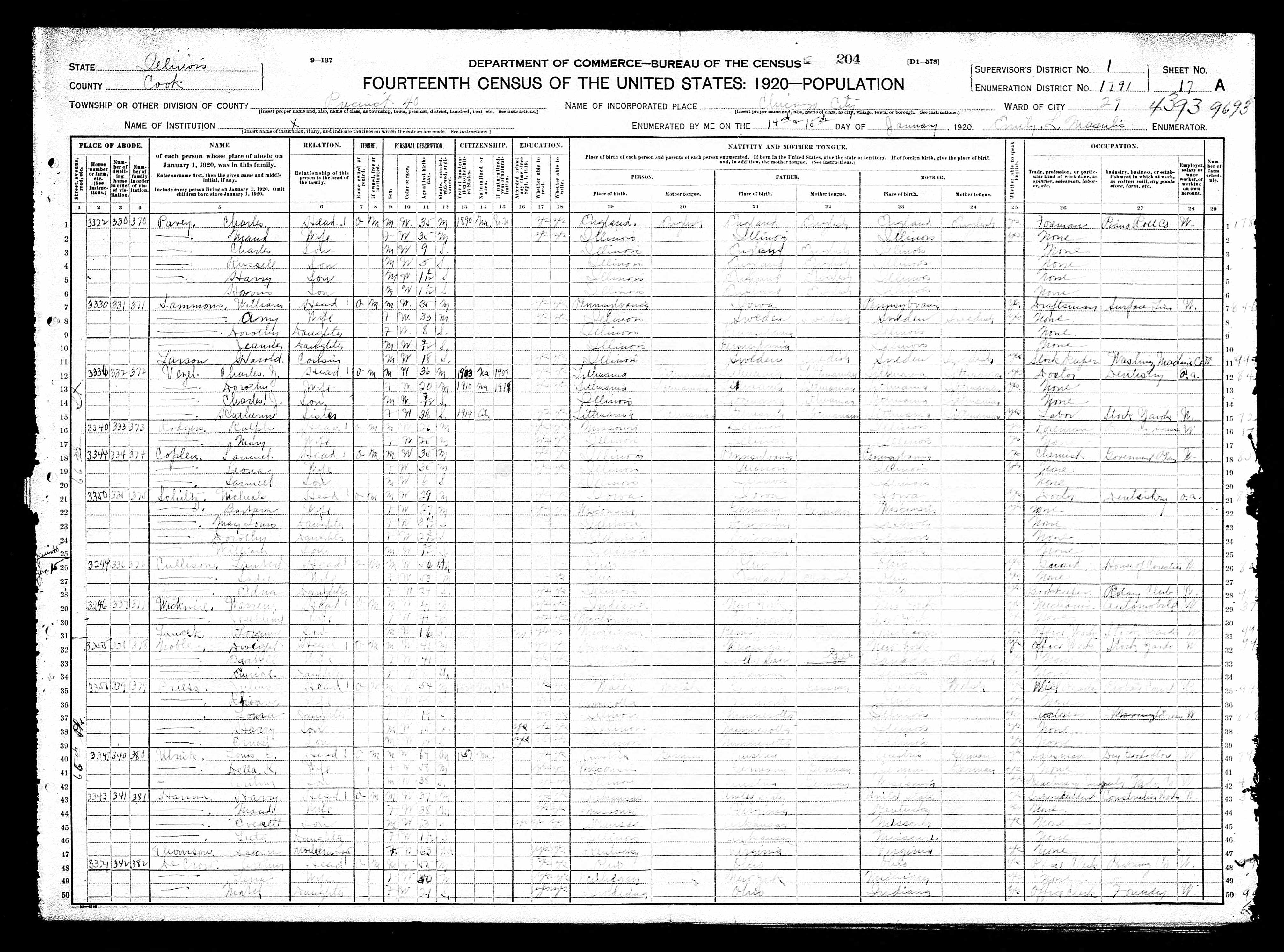 - 1920 United States Federal Census > Illinois > Cook (Chicago) > Chicago Ward 29 > District 1791 > Jeanne Sammons age 0, 66th St., Chicago, Illinois. Living with parents William Sammons (35) and Amy Sammons (33) and sister Dorothy Sammons (8). Also living at the residence was a cousin, Harold Larson (Stock Keeper at a Washing machine Company, 18)