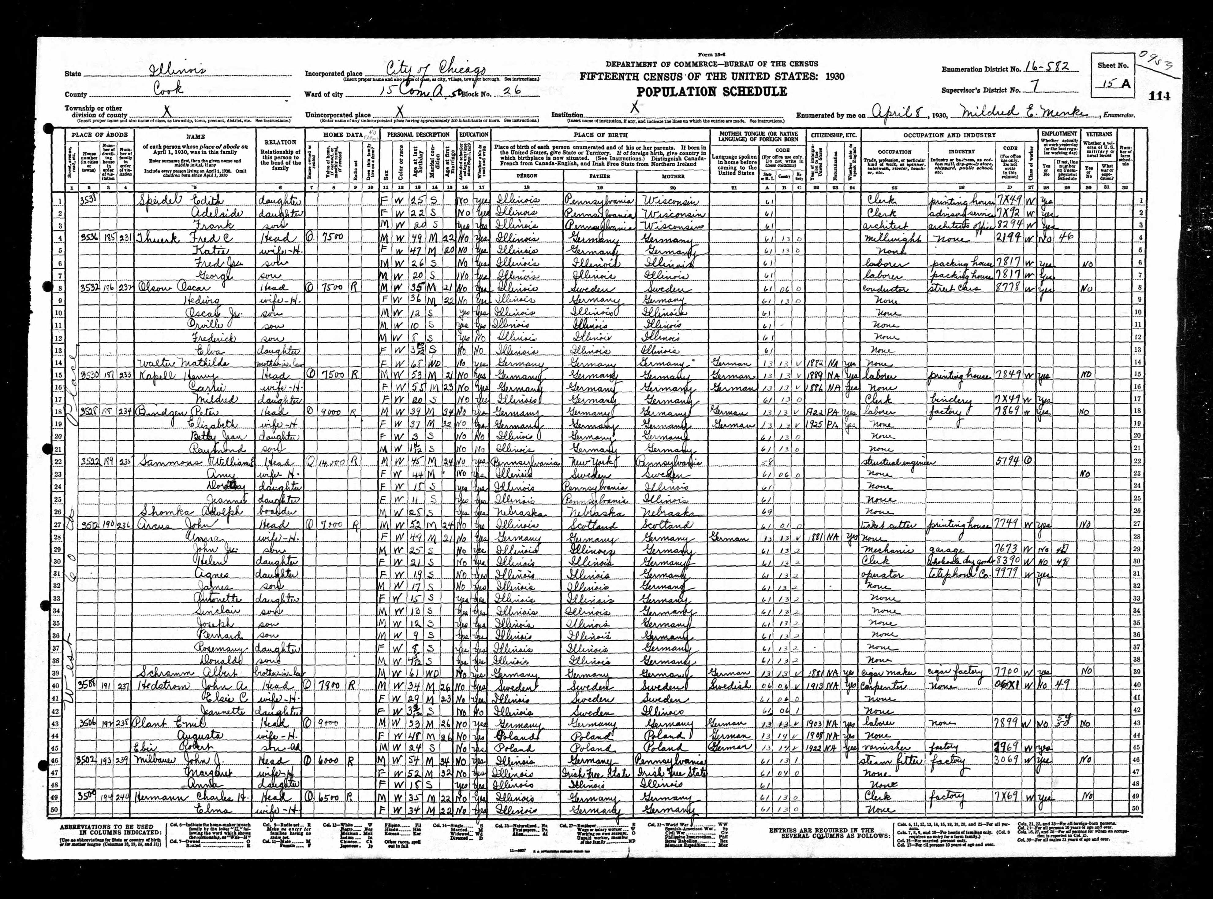 - 1930 United States Federal Census > Illinois > Cook > Chicago (Districts 501-750) > District 0582 > Jeanne Sammons age 11, 3522 West 60th Street, Chicago, Illinois. Living with parents William Sammons (45) and Amy Sammons (44) and sister Dorothy Sammons (18). There was a border, Adolph Shomka (28) living at the residence.