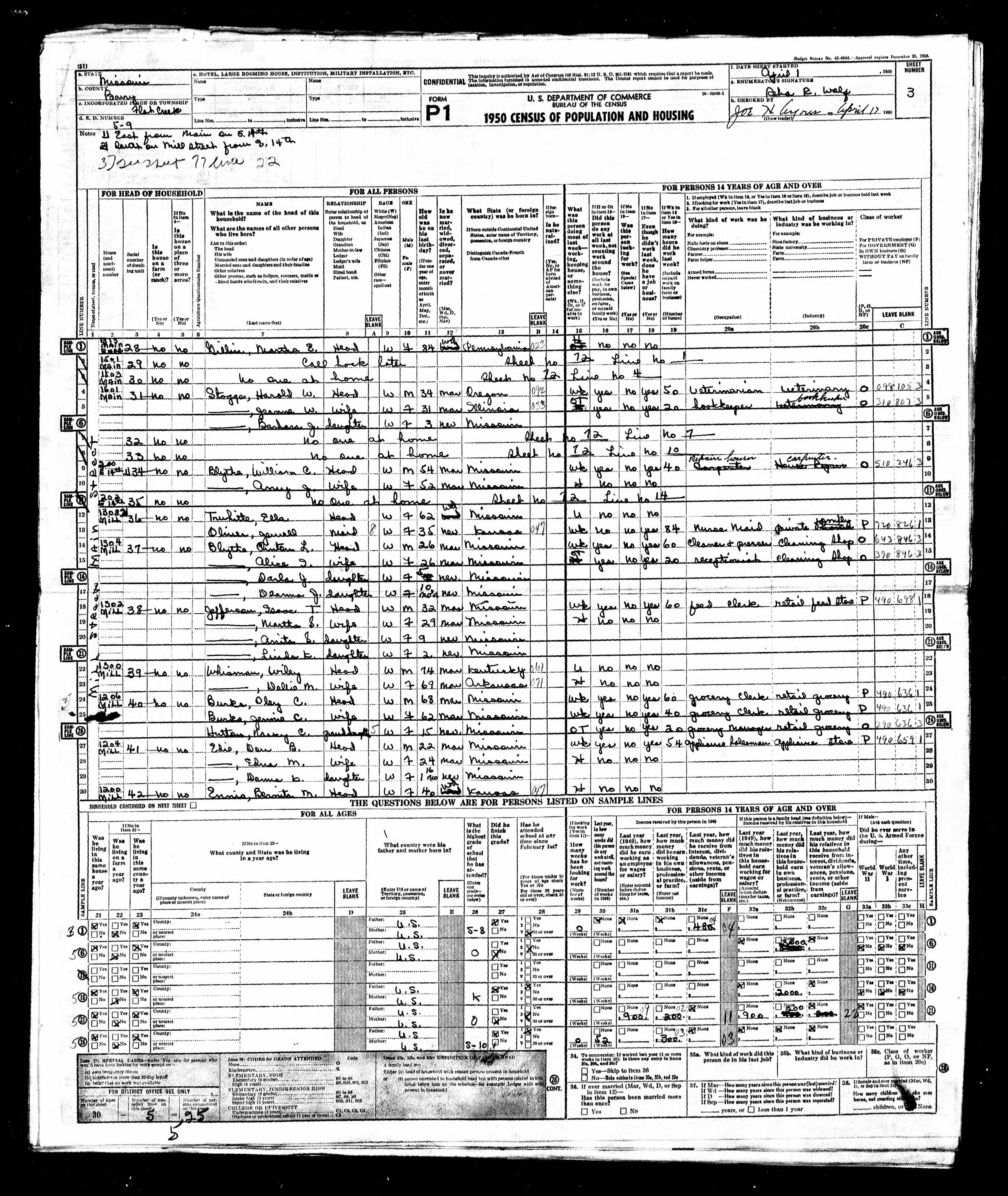 - 1950 United States Federal Census > Missouri > Barry > Cassville > 5-9 > Jeanne W Staggs (bookkeeper, age 31) 1601 Main St, Cassville, Missouri, living with husband Harold W Staggs (34) and Barbara J Staggs (3).