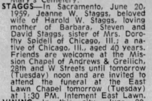 STAGGS-In Sacramento, June 20, 1959, Jeanne W. Staggs, beloved wife of Harold W. Staggs, loving mother of Barbara, Steven and David Staggs, sister of Mrs. Dorothy Spidell of Chicago, Ill.; a native of Chicago, Ill., aged 40 years. Friends are welcome at the Mission Chapel of Andrews & Greilich, 28th and W Streets until tomorrow (Tuesday) noon and are invited to attend the funeral at the East Lawn Chapel tomorrow (Tuesday) at 1:30 PM. Interment East Lawn.