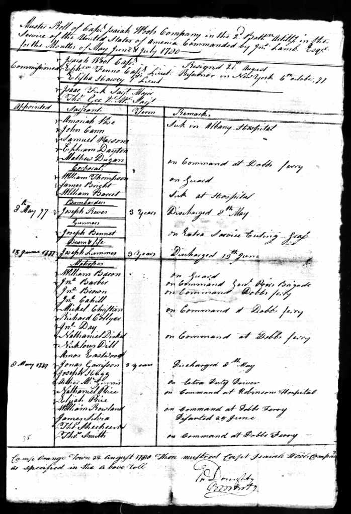 Joseph Stagg served in the 2nd Battalion of the Continental Troops in the American Revolution. On August 22, 1780, his rank was “Matross.” A matross ranked next below a gunner. The duty of a matross was to assist the gunners in loading, firing and sponging the guns. They were armed with muskets and bayonets. They marched with the store-wagons, acting as guards. In the American army a matross ranked as a private of artillery.