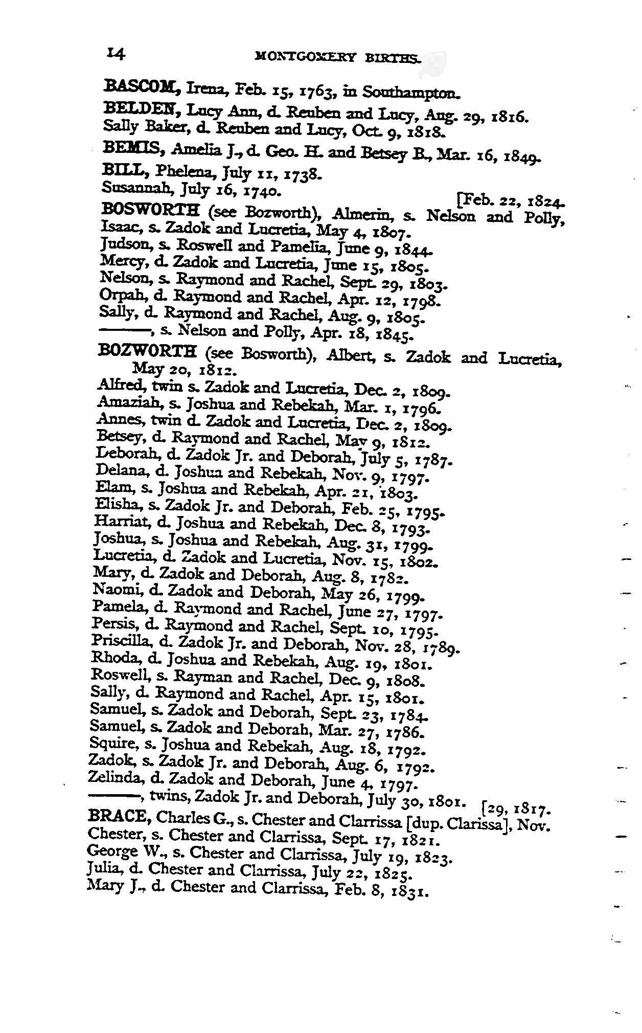 - Massachusetts, U.S., Town Death Records, 1620-1850; Name: Raymond BOSWORTH (see Bozworth); Death Date: July 31, 1835; Burial Place: Montgomery; Source: Montgomery