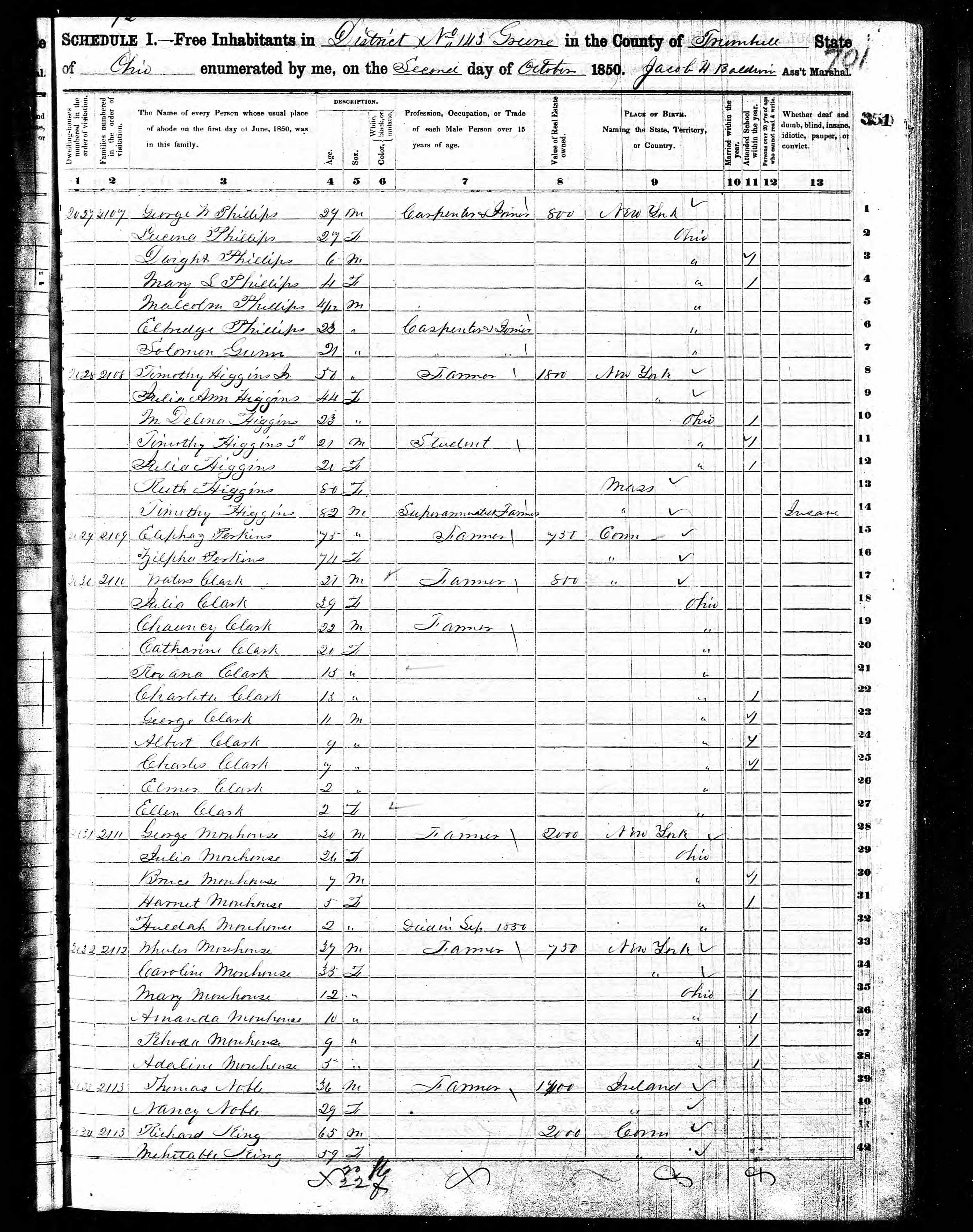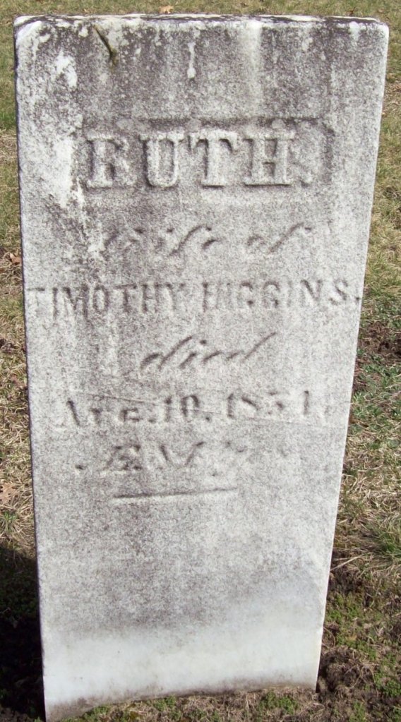 - 1850 United States Federal Census > Ohio > Trumbull > Greene > shows Ruth (age 80) and her husband Timothy Higgins Sr living with son Timothy Higgins Jr and family
