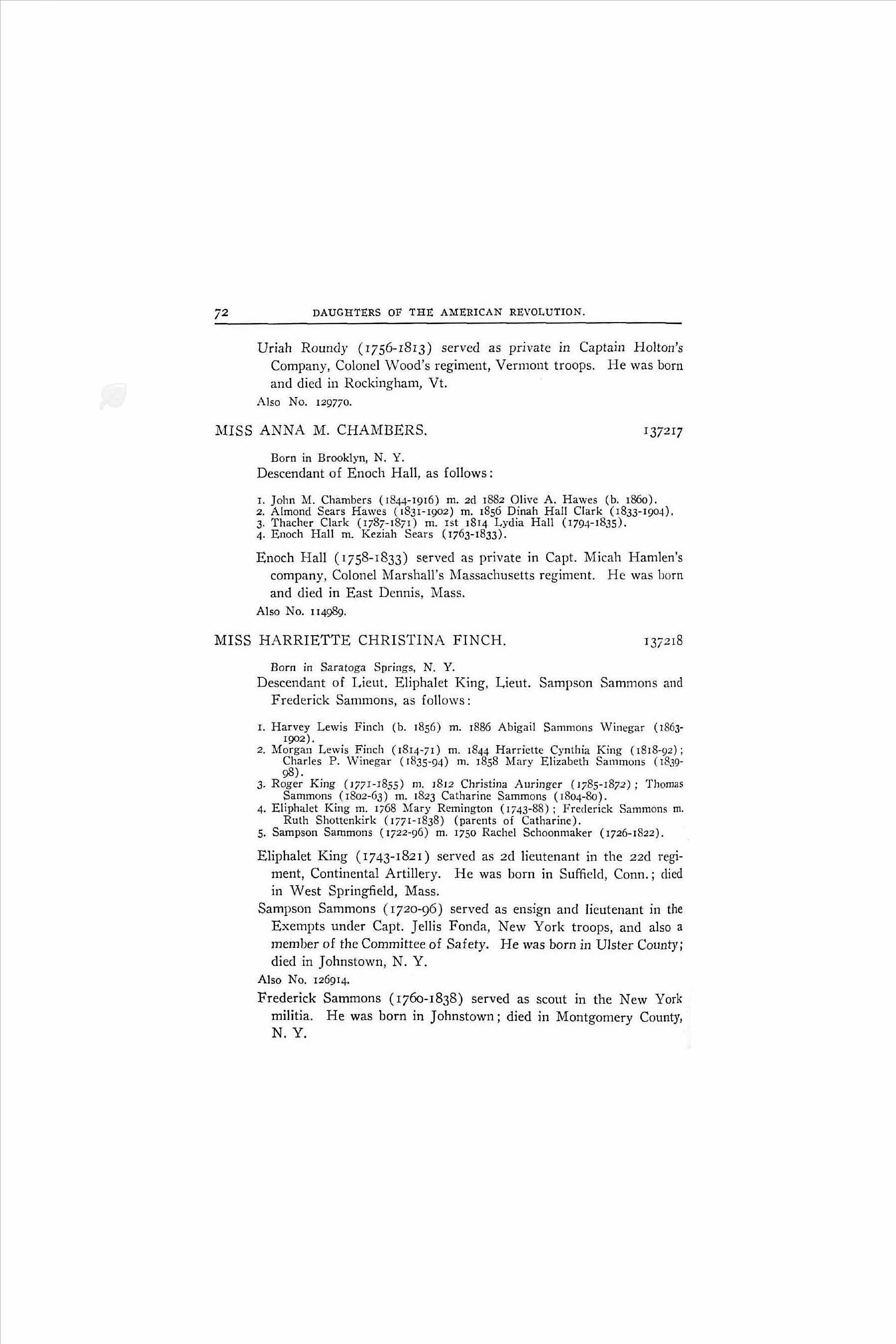 - Daughters of the American Revolution Lineage Book NSDAR Volume 138 1918 > Sampson Sammons (1720–96) served as ensign and lieutenant in the Exempts under Capt. Jellis Fonda, New York troops, and also a member of the Committee of Safety. He was born in Ulster County; died in Johnstown, N.Y.