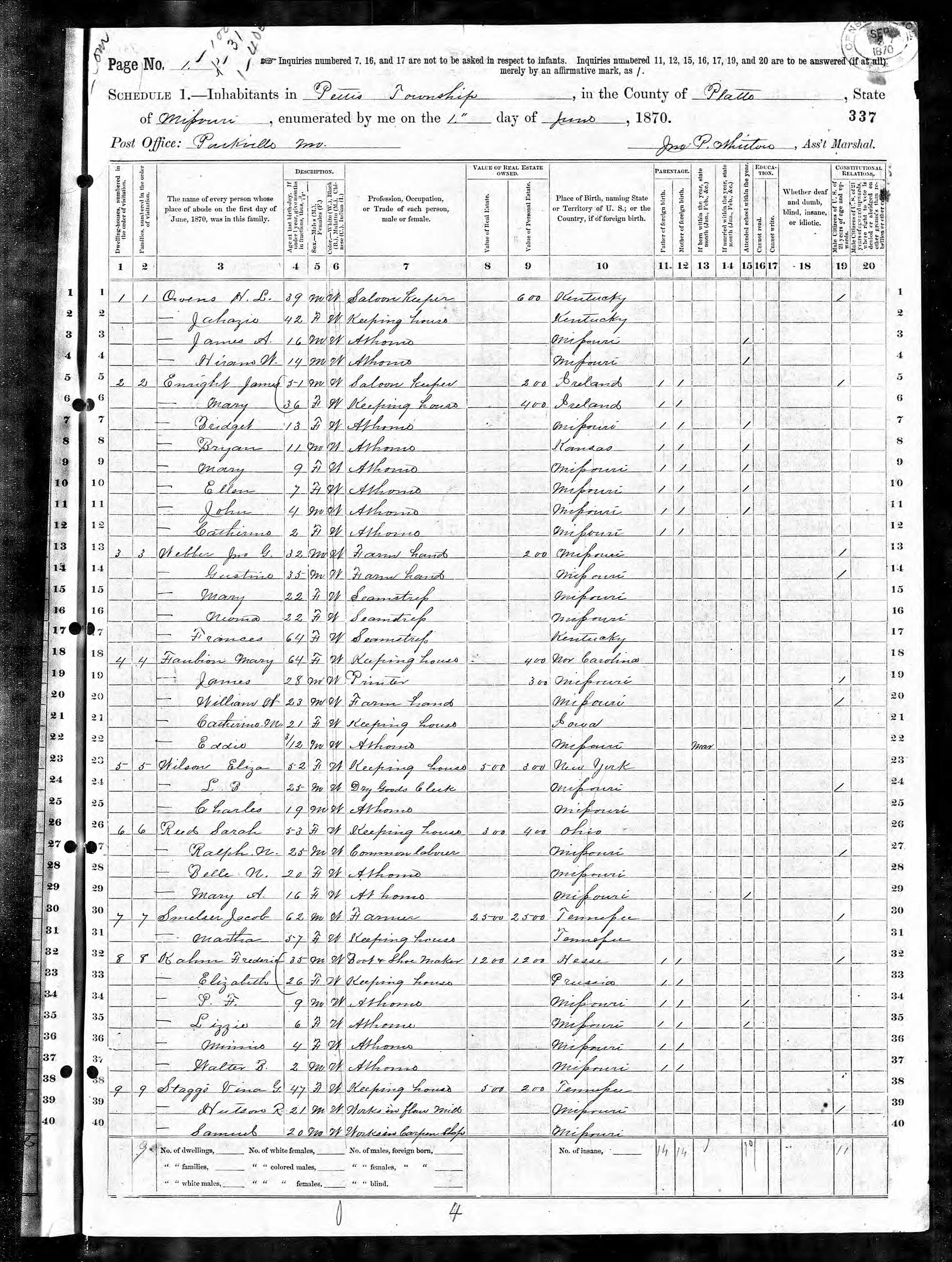 - Samuel E., b. 1850, Platte Co., Mo., m. 29 May 1873, Platte Co., Mo., Adie Dooley, b. 1855, Platte Co., Mo.