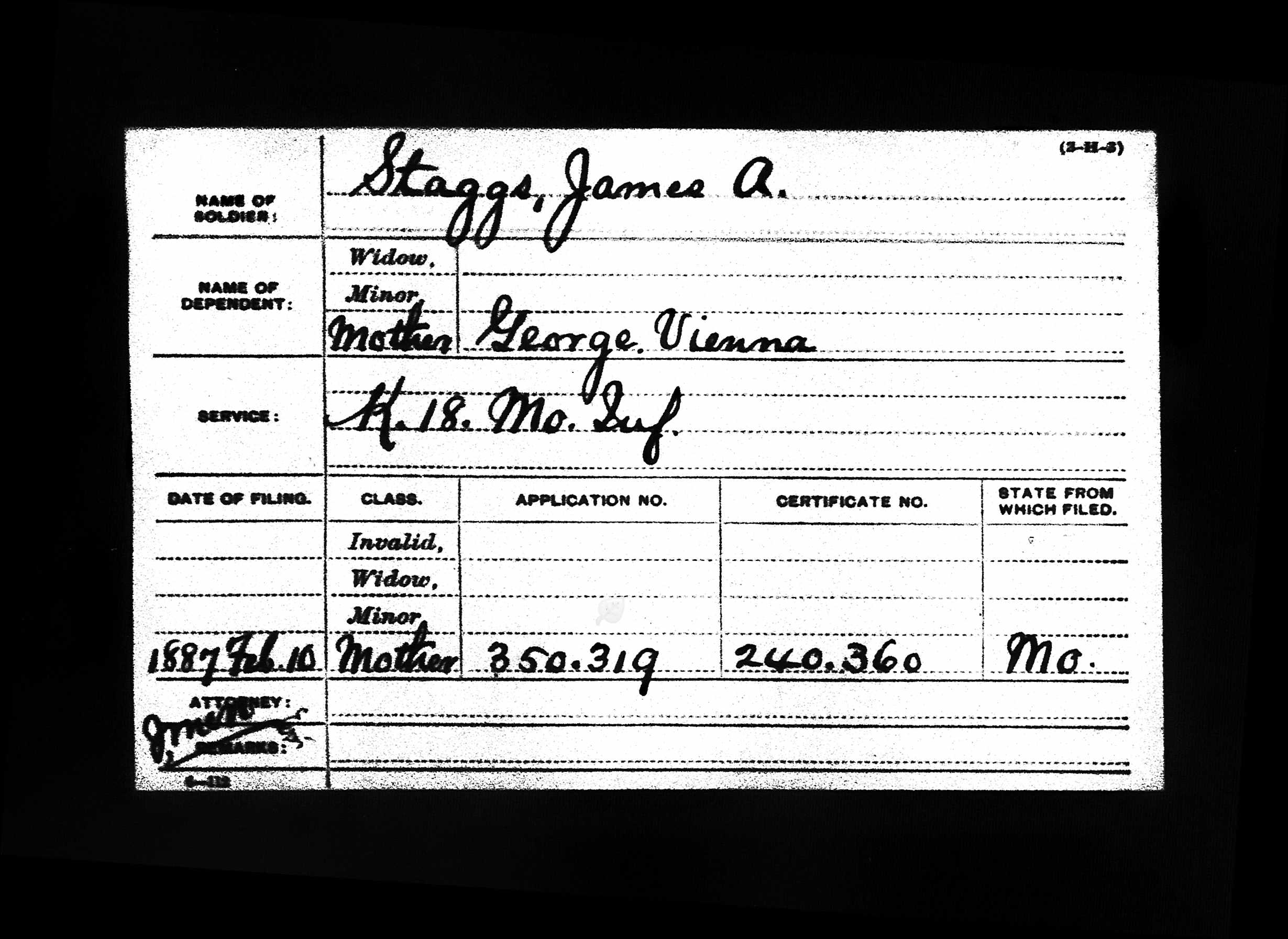 - U.S., Civil War Pension Index: General Index to Pension Files, 1861-1934 > Soldier: Staggs, James A.; Dependent: Mother, George, Vienna