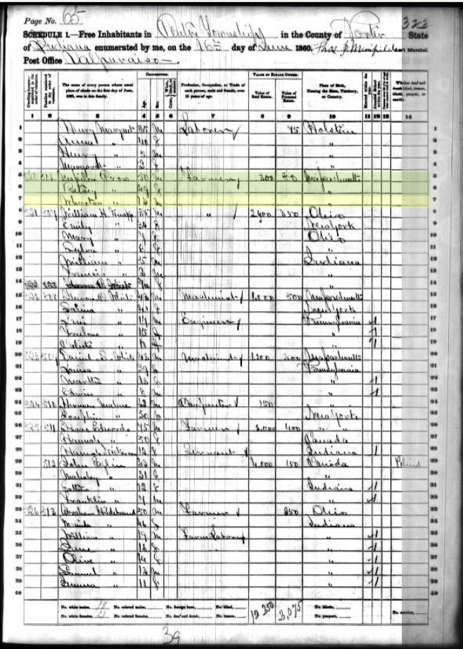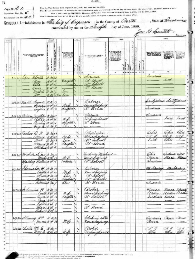 - 1880 United States Federal Census > Indiana > Porter > Valparaiso > 140 > Wharton Crow, widower (farmer, 33), living with 5 children: Alice Crow (13), Ella Crow (11), Anna Crow (5), Melvin Crow (2) and William Crow (5/12)