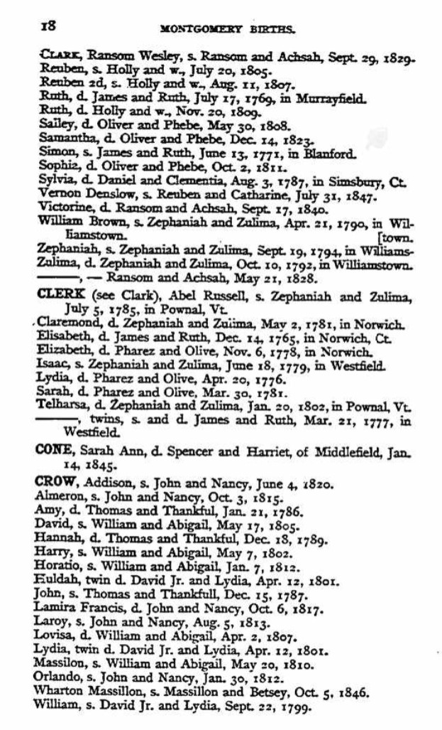 - Massachusetts, U.S., Compiled Birth, Marriage, and Death Records, 1700-1850 > Montgomery > Name: Wharton Massillon Crow; Gender: Male; Birth Date: 5 Oct 1846; Birth Place: Montgomery, Hampden, Massachusetts, USA; Father: Massillon Crow; Mother: Betsey Crow