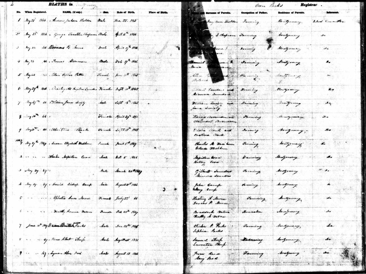 - Massachusetts, U.S., Birth Records, 1840-1915 > Name: Wharton Mapillon Crow; Gender: Male; Birth Date: 5 Oct 1846; Birth Place: Montgomery, Massachusetts, USA; Father: Massillon Crow; Mother: Betsey Crow