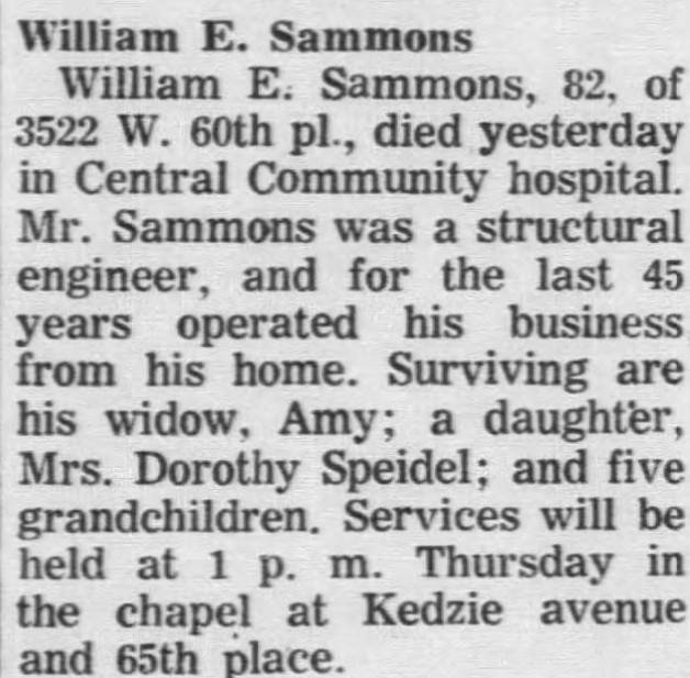 William E. Sammons, 82, of 3522 W. 60th pl., died yesterday in Central Community hospital. Mr. Sammons was a structural engineer, and for the last 45 years operated his business from his home. Surviving are his widow, Amy; a daughter, Mrs. Dorothy Speidel; and five grandchildren. Services will be held at 1 p. m. Thursday in the chapel at Kedzie avenue and 65th place.