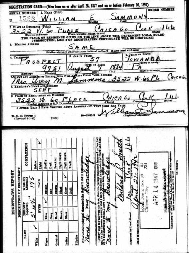 - U.S., World War II Draft Registration Cards, 1942 > Name: William E Sammons; Gender: Male; Race: White; Birth Date: 7 Aug 1884; Birth Place: Towanda, Pennsylvania, USA; Residence Place: Chicago, Illinois, USA; Military Draft Date: 1942