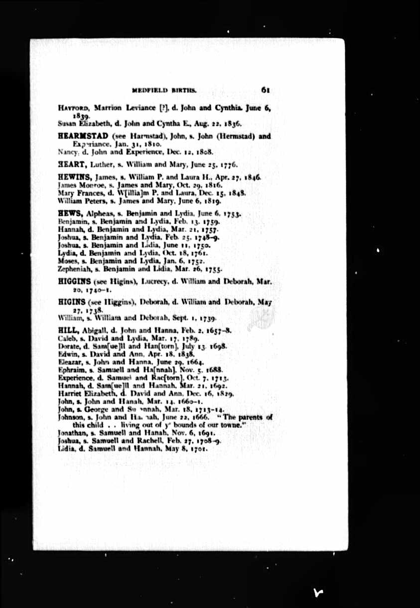 - Massachusetts, U.S., Town and Vital Records, 1620-1988 > Medfield > Vital Record Transcripts > birth of children Lucrecy and Deborah to William Higgins and Deborah