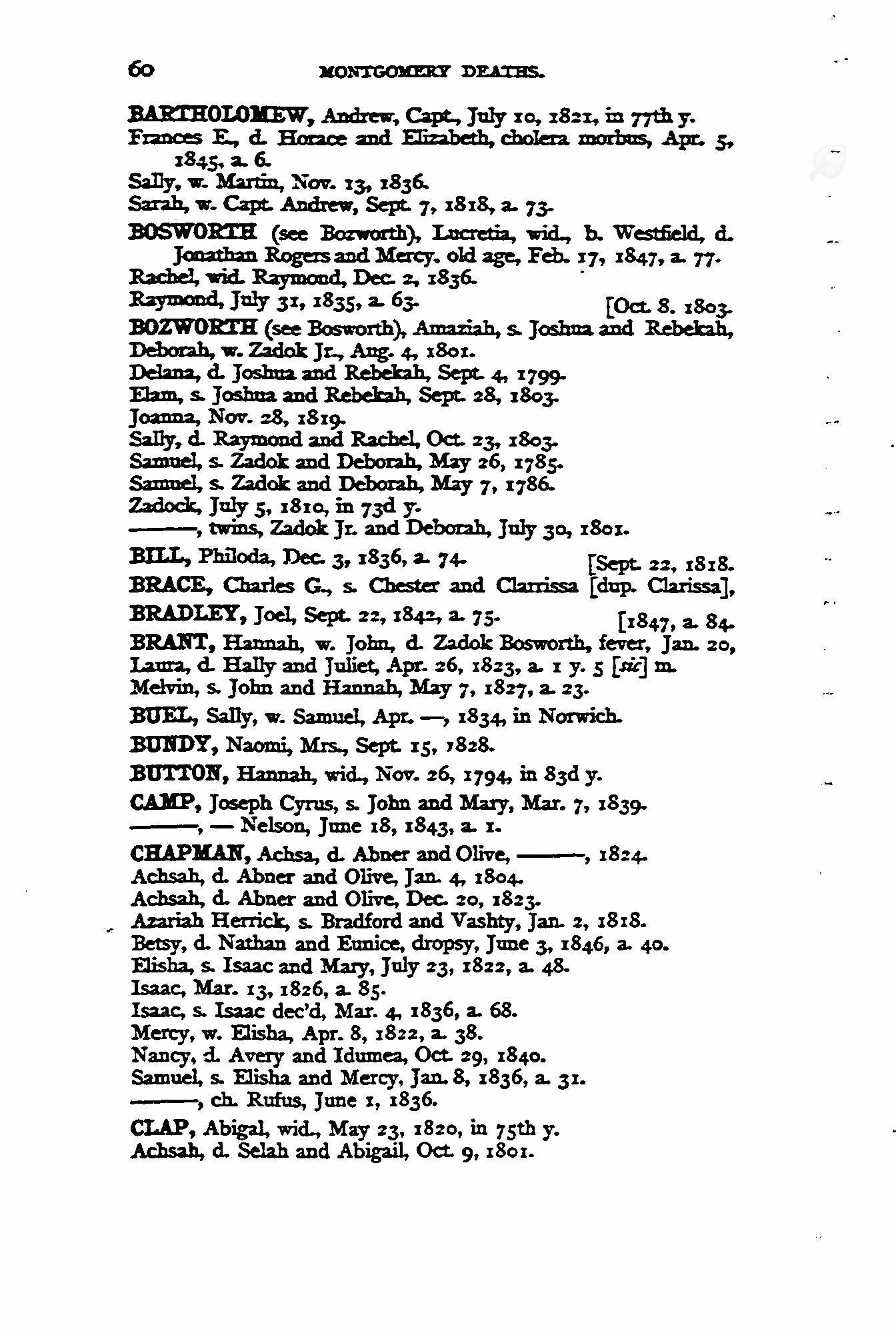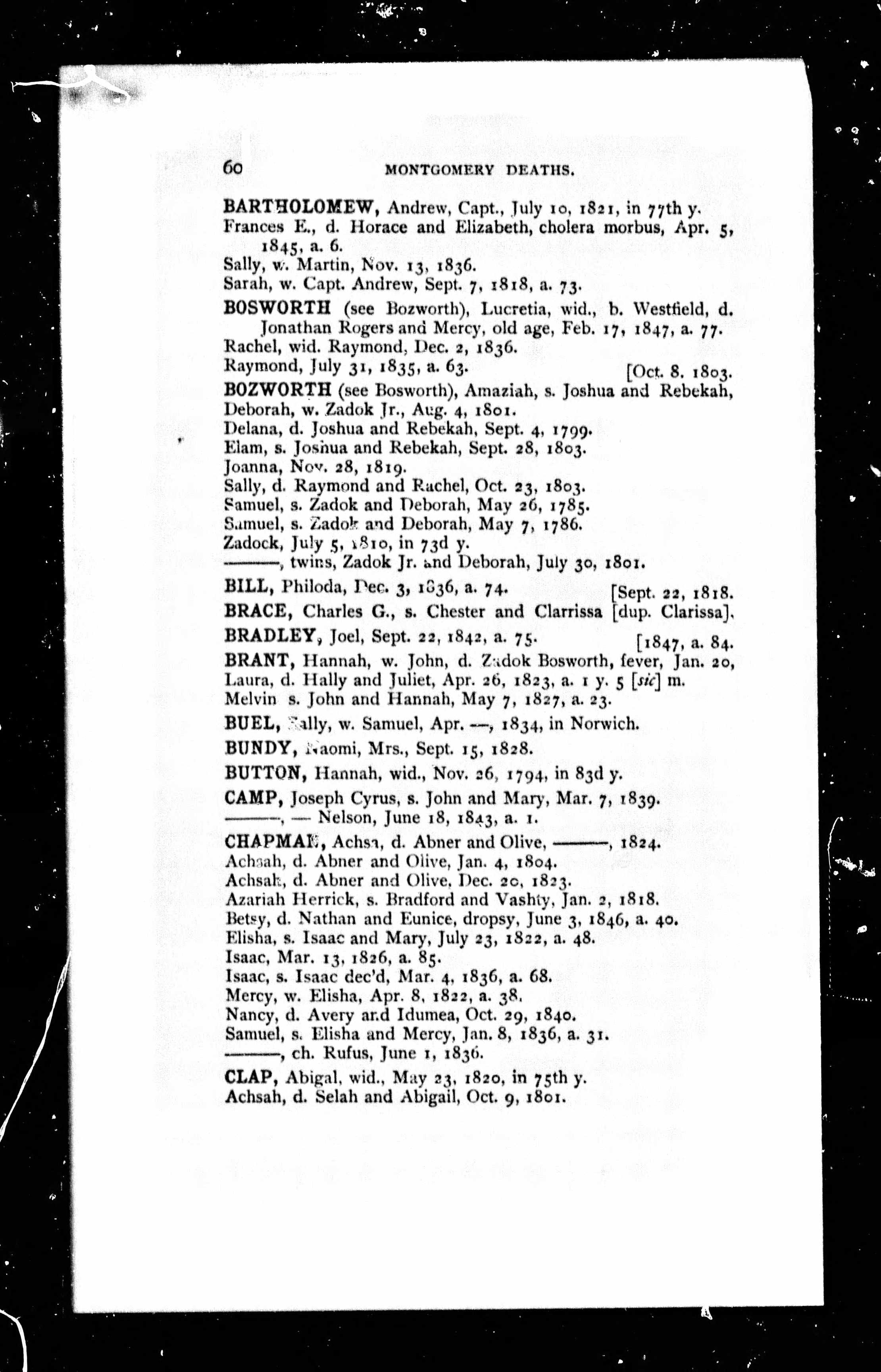 - Massachusetts, U.S., Town and Vital Records, 1620-1988 > Montgomery > Vital Record Transcripts > Montgomery Deaths >Name: Zadock Bozworth; Record Type: Death; Death Date: 5 Jul 1810; Death Place: Montgomery, Massachusetts, USA