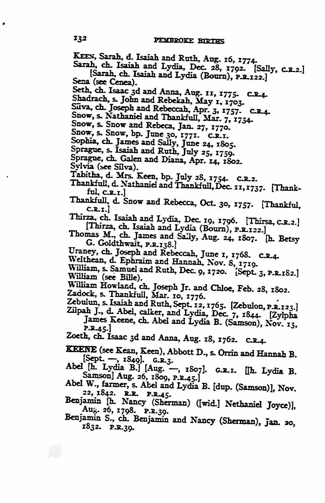 Zebulon, son of Isaiah and Ruth Bisbee Keen, b 9-12-1765, d 8-10-1810. Born in Pembroke, Mass., a cooper and a stone cutter; owned a cooper shop at McGrawville, N.Y., d in Cortland Co., N.Y., married Huldah, b 1765, d 4-1.6-1849 in McGraw, N.Y. Moved to Homer, Cortland Co., N.Y. in 1795 and located on a farm now owned by Mr. Sheffeld; this was an area sparsely inhabited as stated by their son Sprague in his Account Book. They had six children: