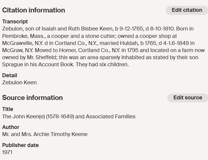 - New York, Genealogical Records, 1675-1920 > Name: Zebulon Keyne; Residence Date: 1800; Residence Place: Homer, Cortland, New York, United States